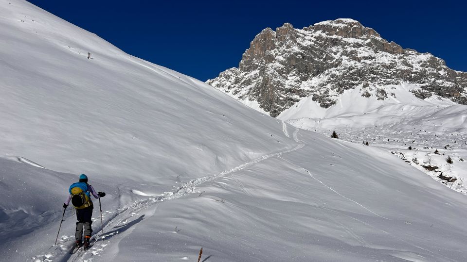 Am Parkplatz nur etwa 20 cm Schnee, aber kein Problem, da Strasse wie präparierte Piste war. Ab Abzweiger Undersäss ausreichend Schnee und in der Abfahrt nur einen Steinkontakt. Der Neuschnee der letzten Tage hat im unteren Bereich unter 2000 m die Spuren vom letzten Donnerstag nicht zudeckt.