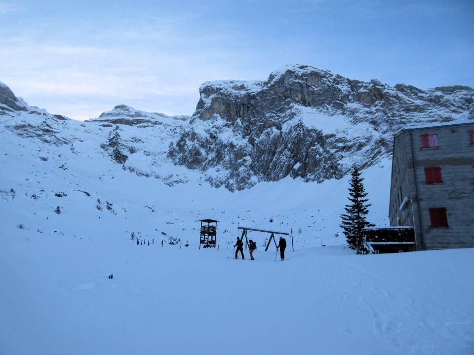 Dann sind wir nach Osten zur Alp Oberberg abgefahren. Gute, z. T. hart Unterlage mit ca. 15 cm Pulverschnee oben drauf - sehr schön zu fahren. Ein paar wenige Steinkontakte. Dann Wiederaufstieg zum Schoneggeli und zum Gipfel hinauf. Skidepot kurz vor dem Gipfel. Beim Aufstieg rutschten die Skis öfters auf der glasigen Unterlage zur Seite.