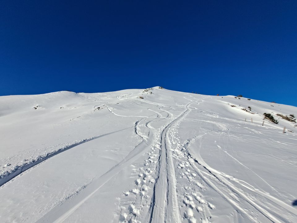 Auf dem Stoos noch knapp Nebel der sich dann aber bald lichtete. Gut gespurt bis auf den Gipfel. Wenig Schnee, aber kein Steinkontakt heute. Noch sehr schöner Pulverschnee angetroffen.