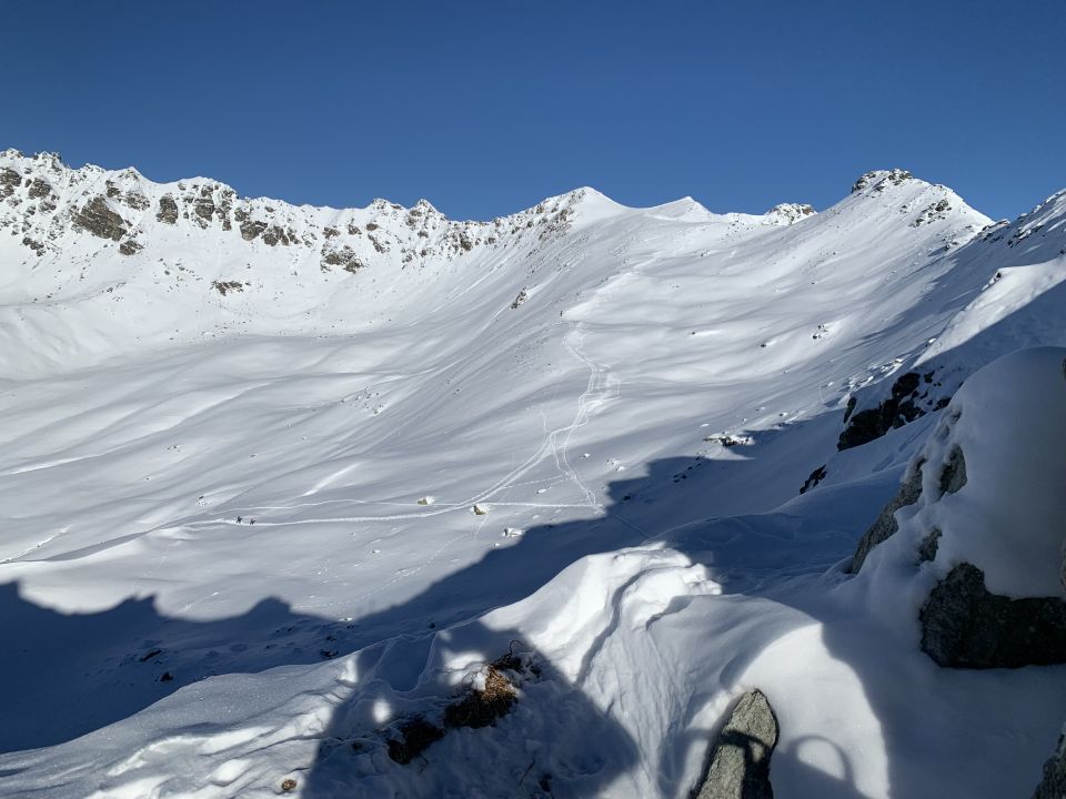 Morgens gut kalt in Gargellen, Aufstieg über die Piste, dann durch das Täli, das noch nicht präpariert ist, zum Joch. Schneedecke gerade ausreichend, feiner Pulver auf harter Unterlage.
