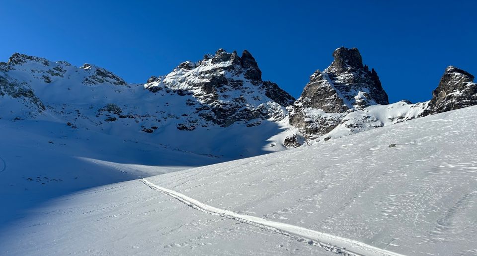 Wetter kalt und sonnig, Schnee mehrheitlich pulvrig, aber in erstaunlich geringen Mengen im Vergleich zu benachbarten Gebieten; nervenaufreibend mit der ständigen Angst, einen knapp eingeschneiten Stein zu erwischen.