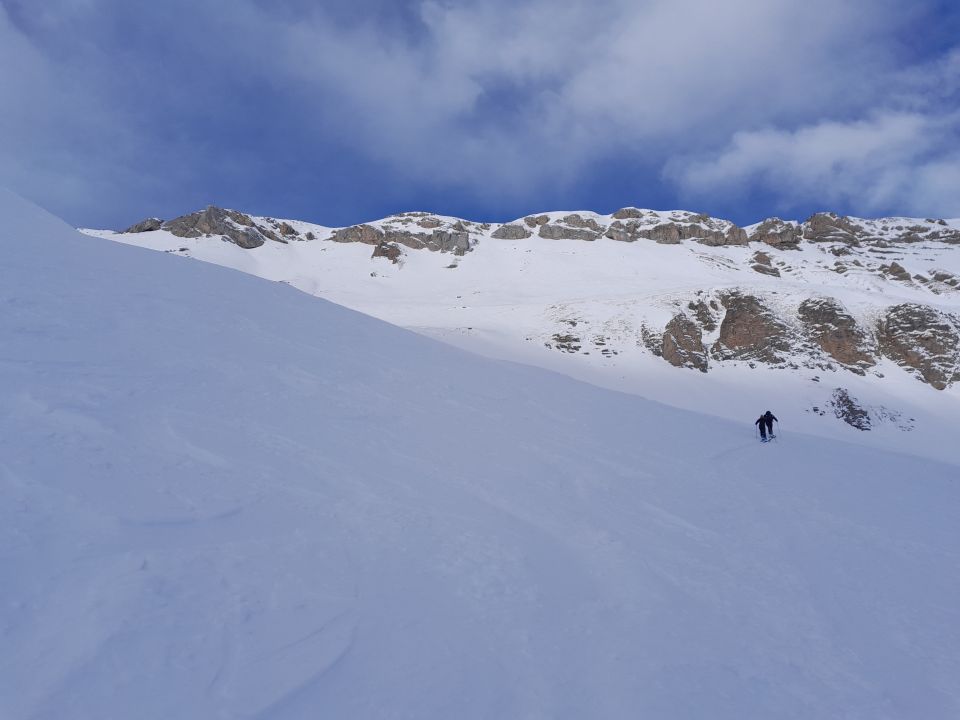 Kurz nach dem Start hat starker Wind angefangen und uns bis zum Gipfel begleitet. Der Schnee war trotzdem gut und genug. Ca. 30 m vor dem Gipfel Skidepot und zu Fuss zum Kreuz da einige Steine und Grass sichtbar. Überall sehr viele Spuren aber trotzdem noch ab und zu freies Pulverschnee für unsere eigene Spur gefunden.