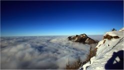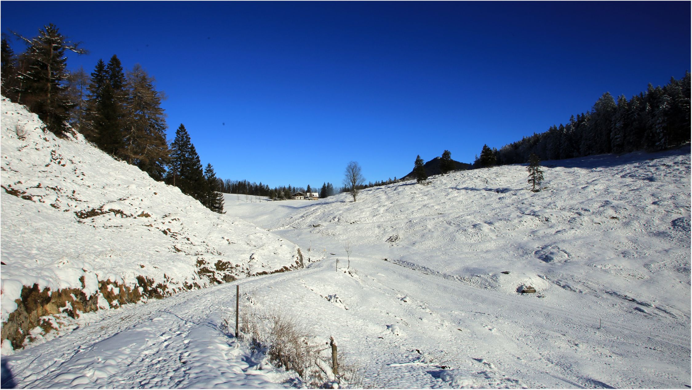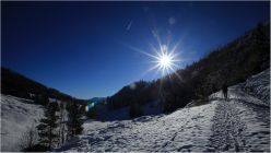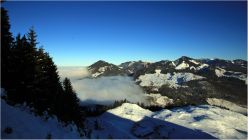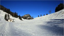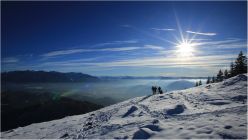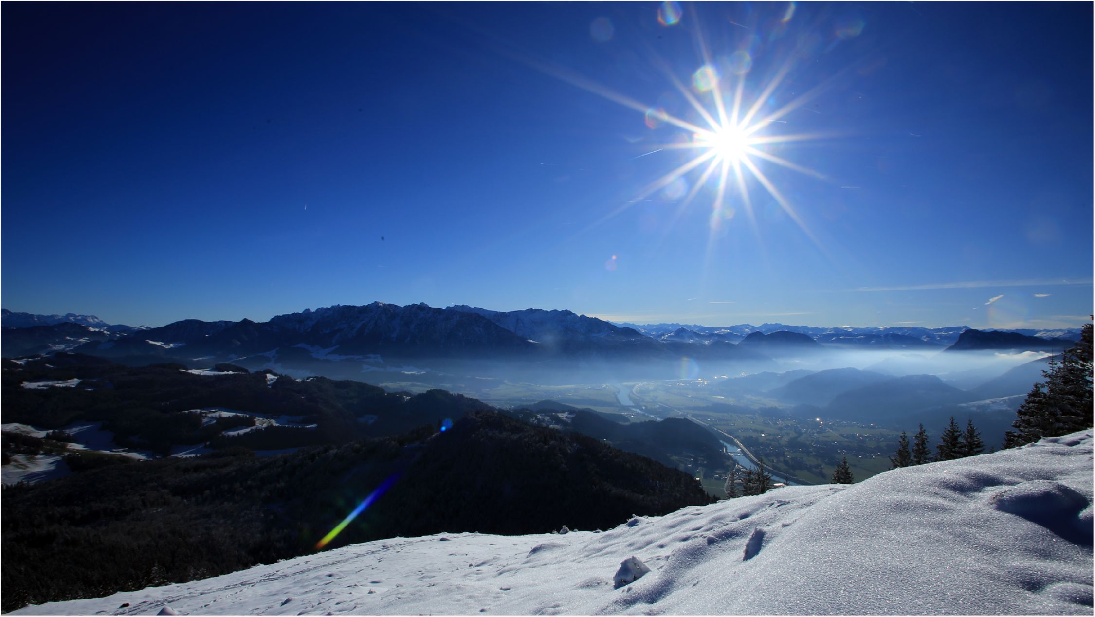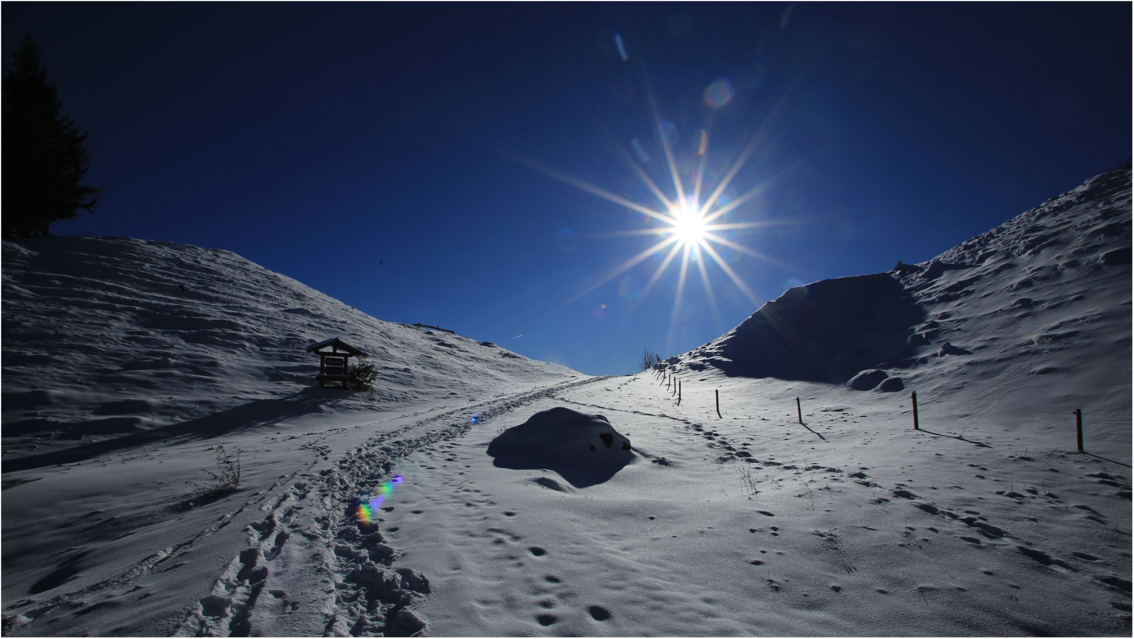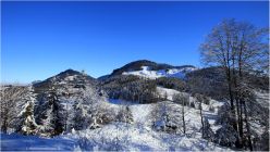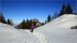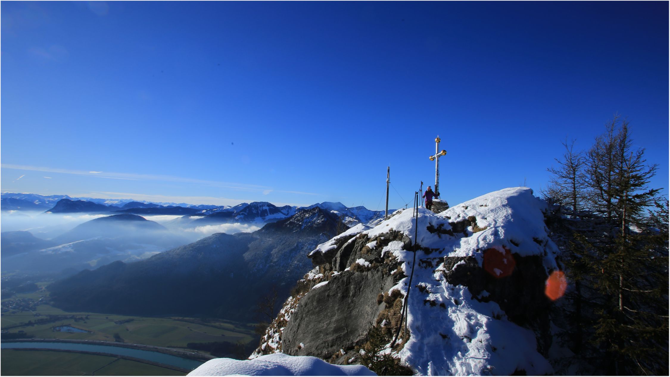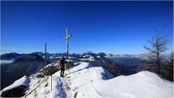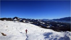 Am Parkplatz im Prinzip kein Schnee, vielleicht ein paar cm. Danach zwar mehr werdend insgesamt bis Kranzhornalm max. 15cm. Spur vorhanden Ab dort dann recht unterschiedlich, mal mehr mal weniger Schnee aber gut zu gehen. Am frühen Morgen können Grödel angenehm sein, aber nicht dringend notwendig. Im Schatten recht frisch, in der Sonne, dort wo kein Wind wehte mollig warm. Auf dem Gipfel stürmischer Südwind.
