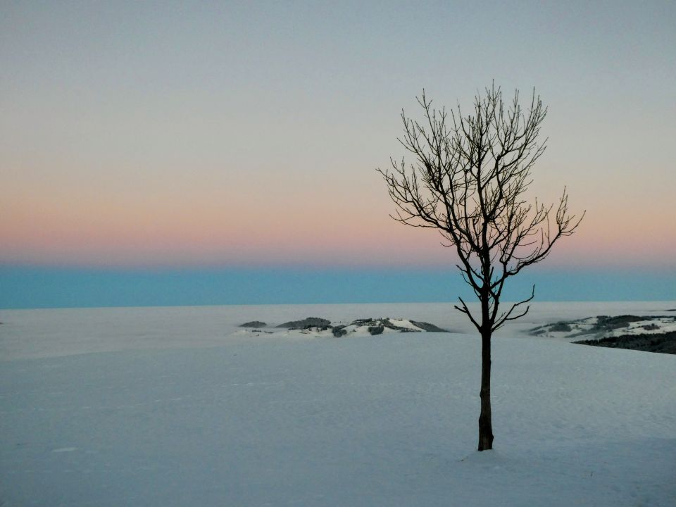 Tourstart kurz nach 7.00 bei dichtem Nebel und -6°. Die Nebelobergrenze lag nur wenig oberhalb des Dorfes Eggerstanden. Darüber herrschte morgens noch ein wolkenloser Himmel.