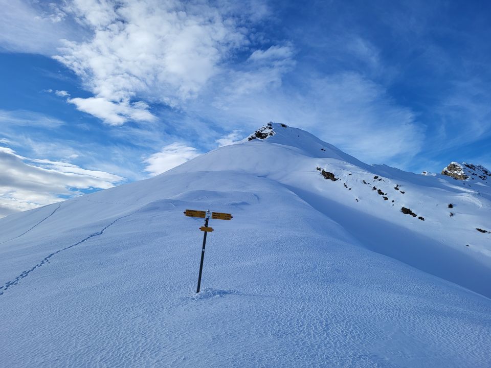 Sehr viel Schnee auf der Nord-Seite des E-Grats (alles Pulver). Der NW-Grat zum Gipfel ist gut begehbar. Der Schnee in der Abfahrt zur Alp Obere Meiel ist super, leider hatten wir schlechte Sicht wegen den aufziehenden Wolken.