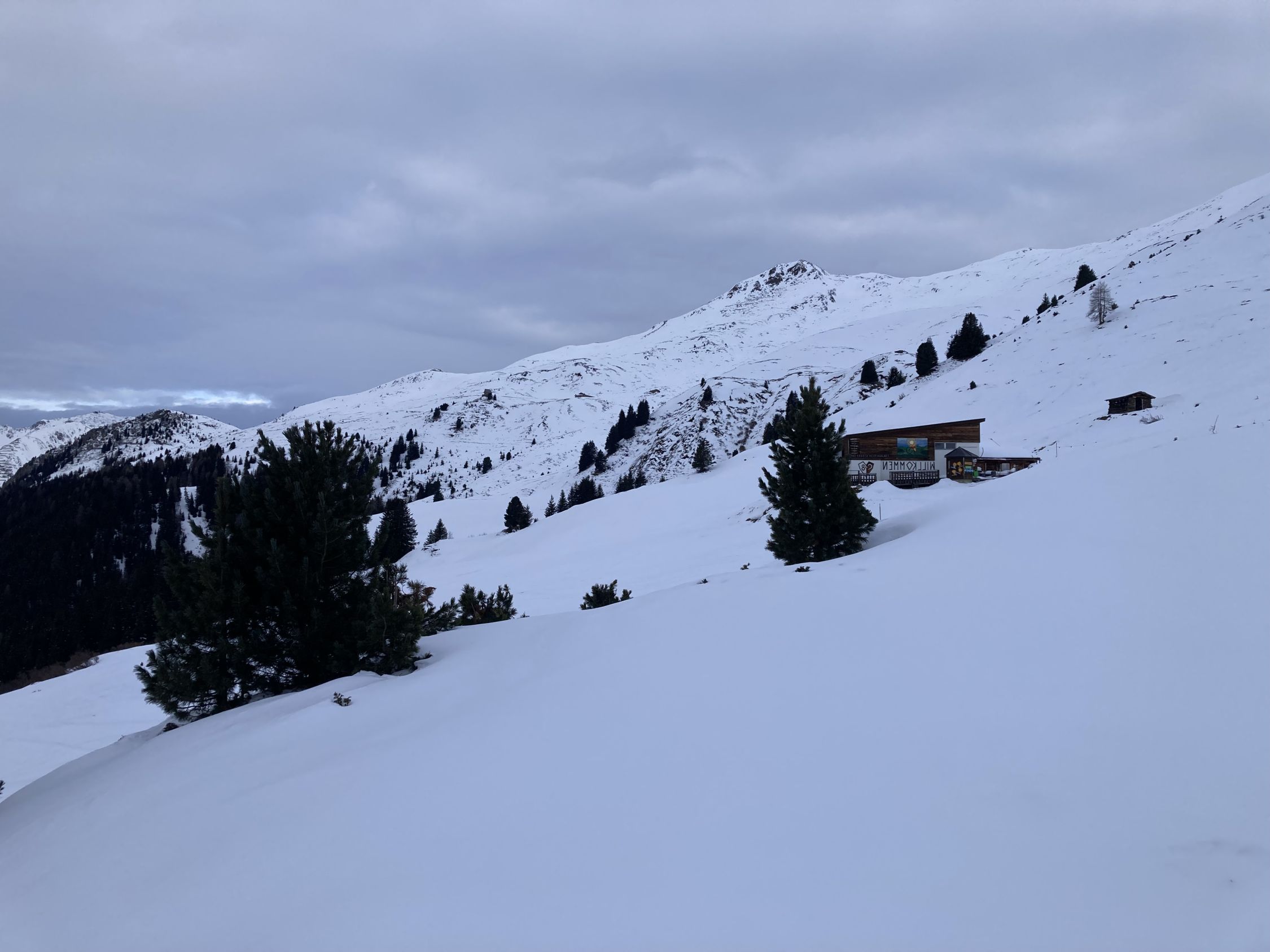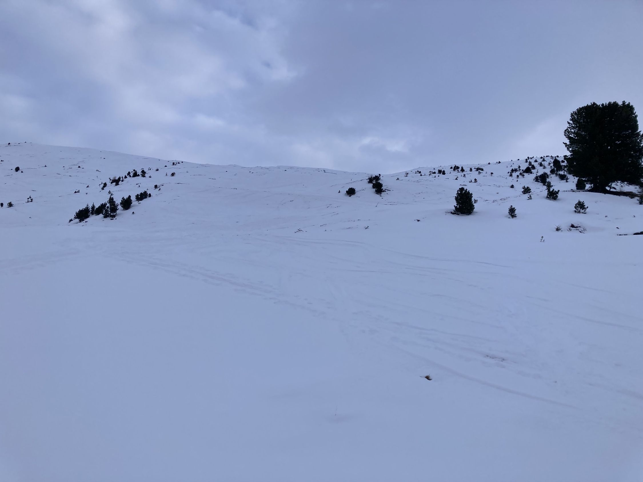 Daher bin ich am Punkt 2593 umgedreht, ich fuhr am alten Trassee des Schlepplifts ab, an der Talstation des ehemaligen Schlepplifts fellte ich wieder an. Abfahrt bis hier v.a. Ab der Bergstation Pischa gut eingeschneit, und unverspurt. Es hat lediglich zwei Schneeschuspuren und den fast fertig präparierten Winterwanderweg.
