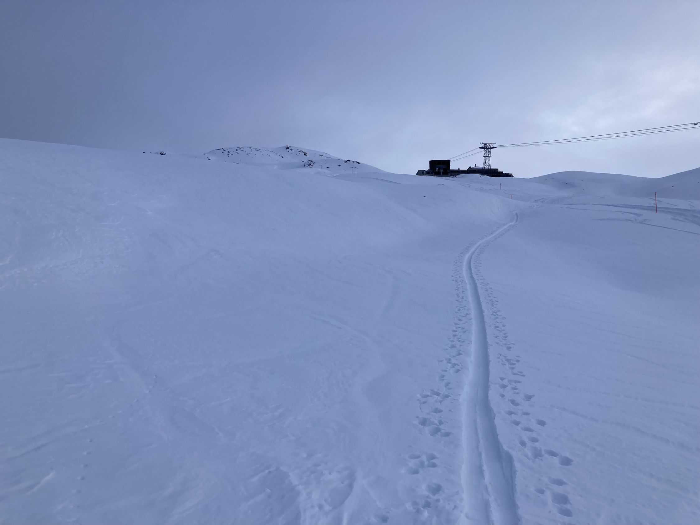 Ich bin ab der Bergstation der Pischabahn noch hoch bis zum Einstiegspunkt der Skiroute zum Pischahorn gestiegen, sobald es steiler wurde / man Wiesengelände verlässt - zunehmende Gefahr von Feindkontakt.
