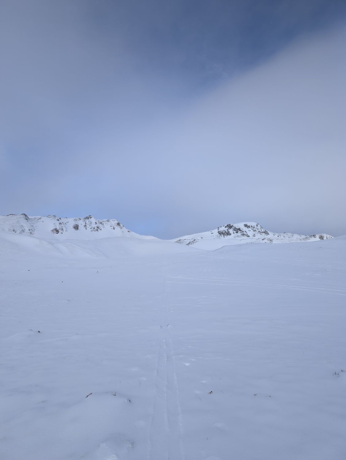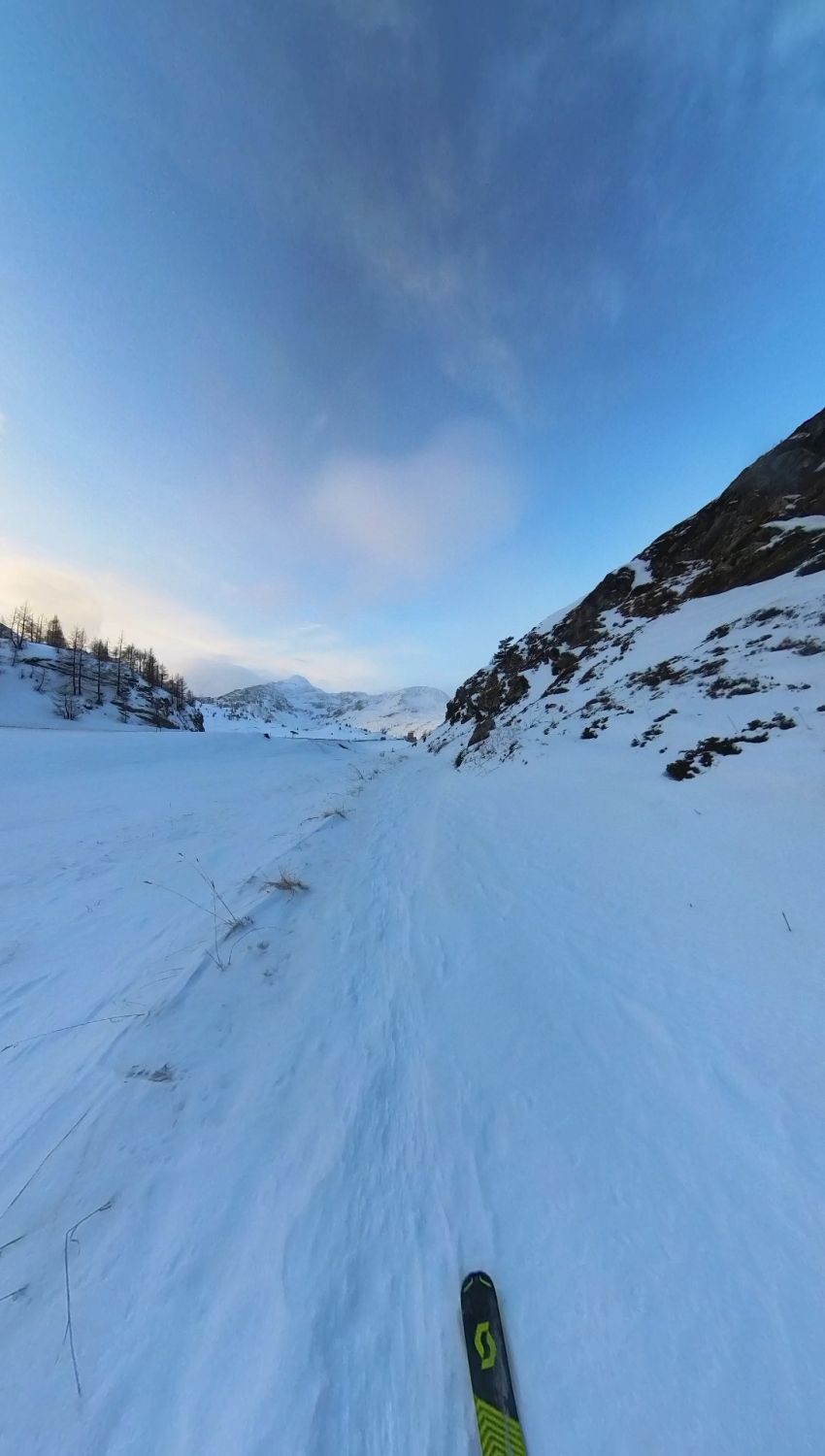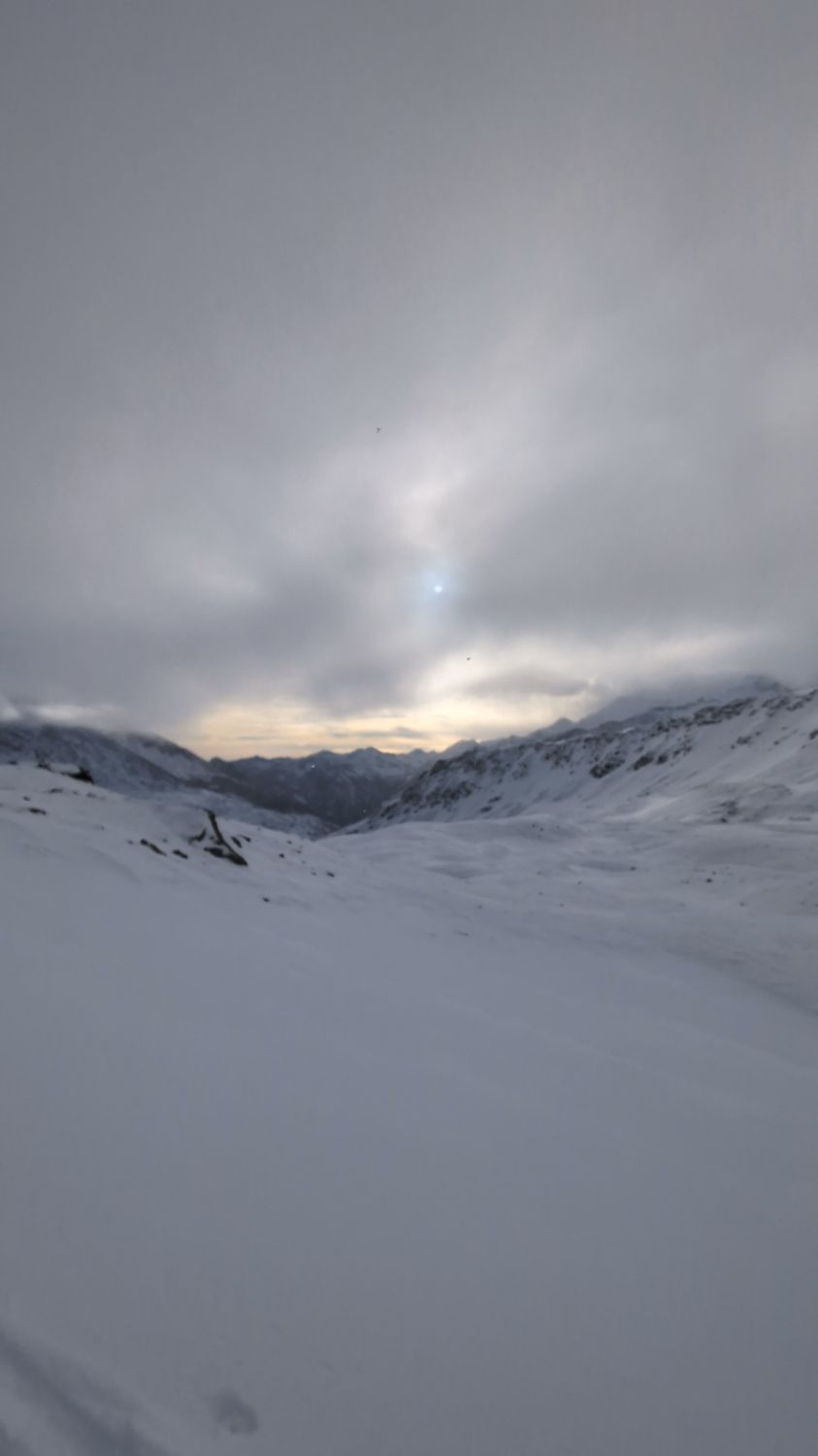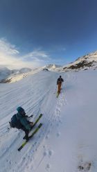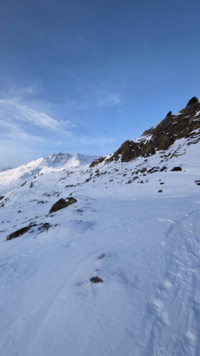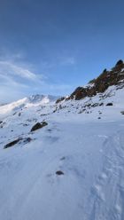 Unten zum teil bruchharsch zum teil hart Schnee aber nie Eisig. Ab ca. 2400m 5-10 cm locker Schnee, vor allem in Mulden. Gipfelhang (SW) abgeblasen. Knapp genügend Schnee im Aufstieg. Abfahrt vom Gipfelhang mit den Felle bis zurück im Osthang. Allgemein positiv überrascht mit der Schnee Menge obwohl wir 1-2 Steine getroffen haben.