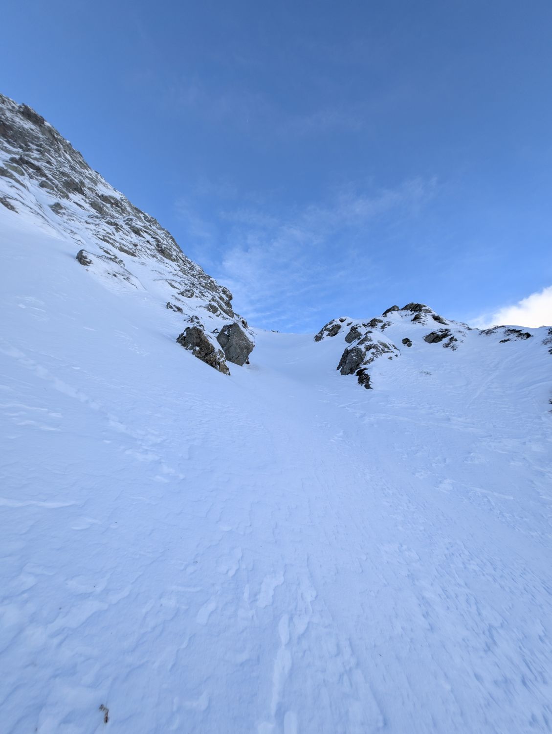 Das Couloir wäre wahrscheinlich mit Sicherheitsmassnahmen (Abstände) befahrbar gewesen. Die möglichen Konsequenzen waren vertretbar (kleine Lawine und keine Absturzgefahr). Tatsächlich stieg nach uns eine Gruppe von fünf Personen auf. Dennoch ist Vorsicht geboten.