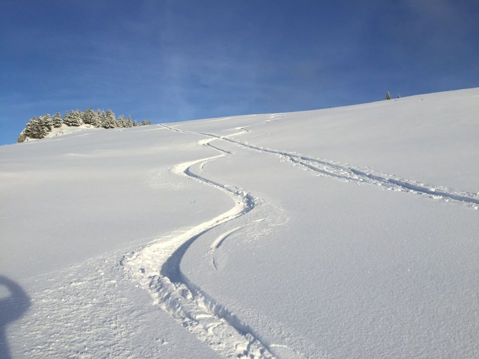 Geissboden beim Start 20 cm Pulver auf sehr knapper Unterlage…..Abkürzungen eingeschneit….. oben 30 cm Pulver auf Unterlage die auch nicht sehr dick ist. Gipfelhang direkt habe ich ausgelassen. Der schöne Rücken in der Abendsonne war top! kalte Abfahrt die Forststrasse runter.