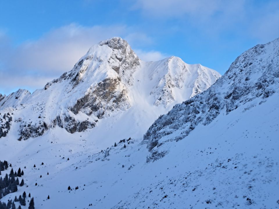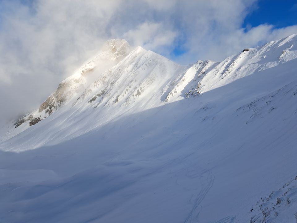 Abfahrt Nordflanke einfahrt bei vorsichtiger Routenwahl mit gutem Pulverschnee sehr schön zu fahren