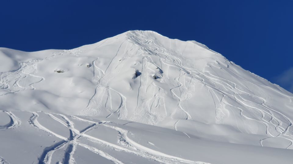 In schönstem Pulverschnee - wie es immer sein könnte - genossen wir nach einer kurzen Pause die Abfahrt. Soweit dies geländetechnisch möglich war (Hoger, flache Stellen). Unterhalb ca. 1500 m.ü.M. war der Schnee dann doch manchmal etwas knapp an vereinzelten Stellen, Steine waren unter dem weichen Pulverschnee und Feindkontakt konnte somit leider nicht komplett verhindert werden. Am Ende reichte es jedoch gerade noch, ohne die Ski vor dem Ende der Abfahrtsstrasse abzunehmen und ohne viele Kratzer.