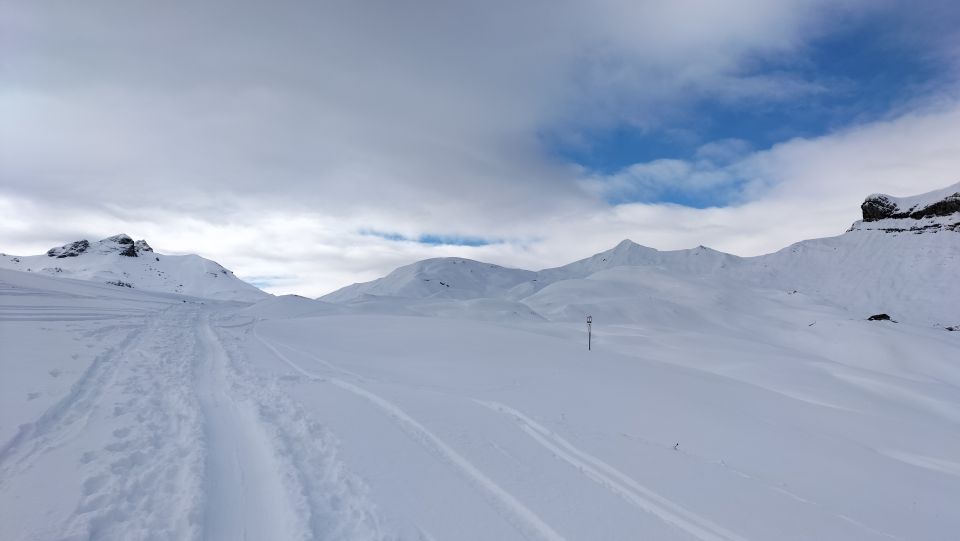 Daten der Tour: 1130 Höhenmeter im Auf/Abfahrt mit einer Gesamtlänge von einer 16 Km, Kondition mittel, Exposition NE, Lawinenstufe heute Erheblich 3-.