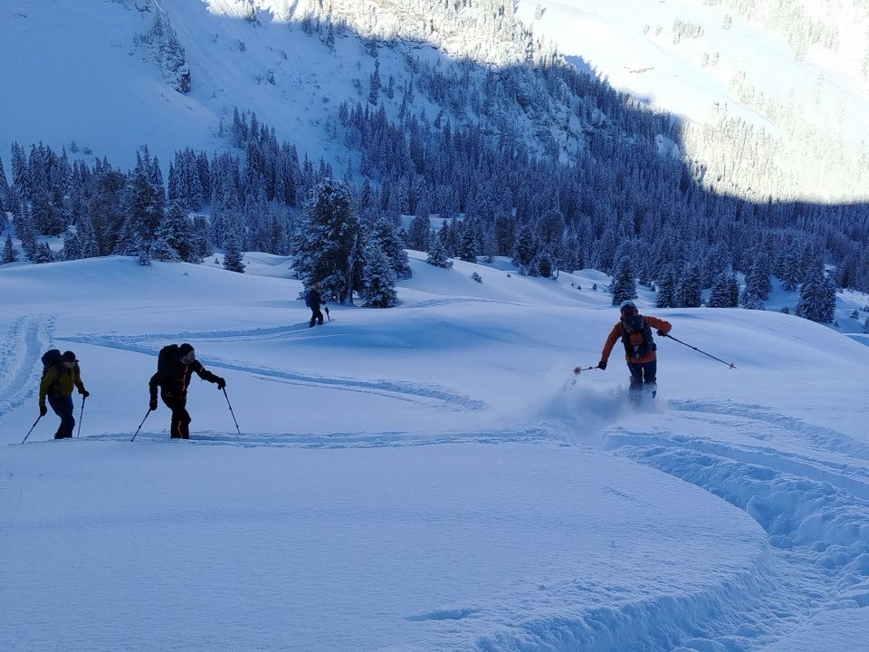 Wir waren nicht auf dem Gipfel, sondern im Sattel südlich davon. Viel (sicher über 60cm) perfekter Pulver. Dank genügend steilem Hang grosser Genuss. Grosser Dank dem Spurer!
