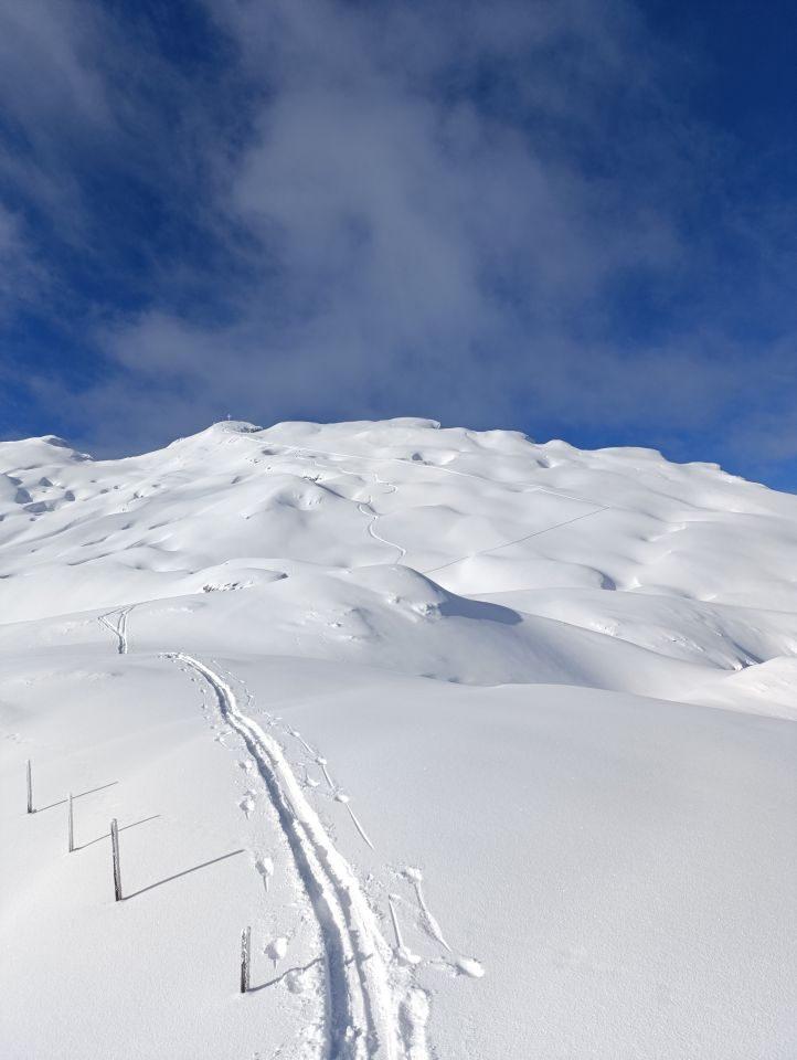 Sehr gute Verhältnisse auf der ganzen Route angetroffen.Pulverschnee vom Parkplatz bis zum Gipfel ohne Steinkontakt, wie man es sich wünscht. Aufstieg mit den Skis bis zum Gipfelkreuz.