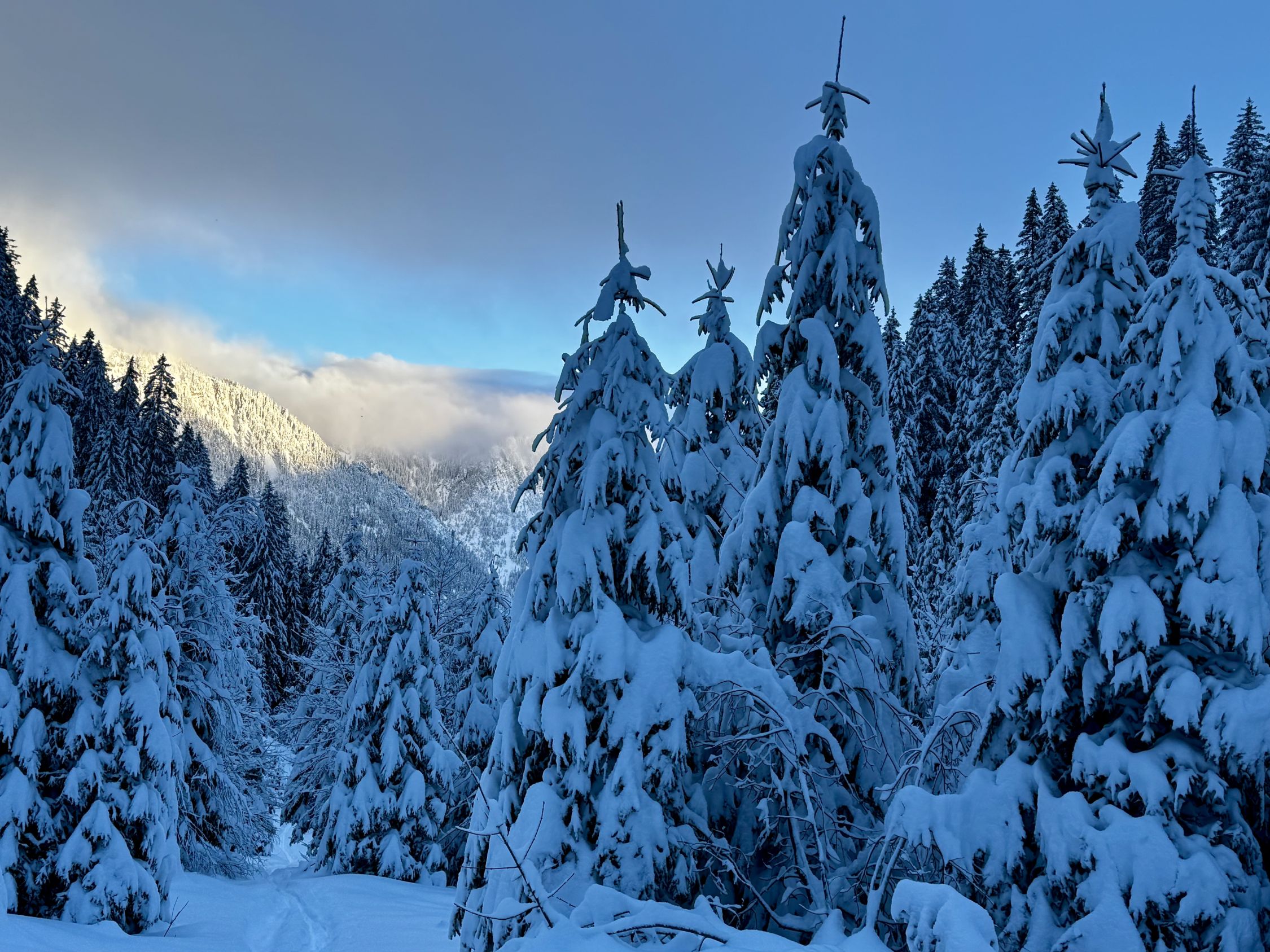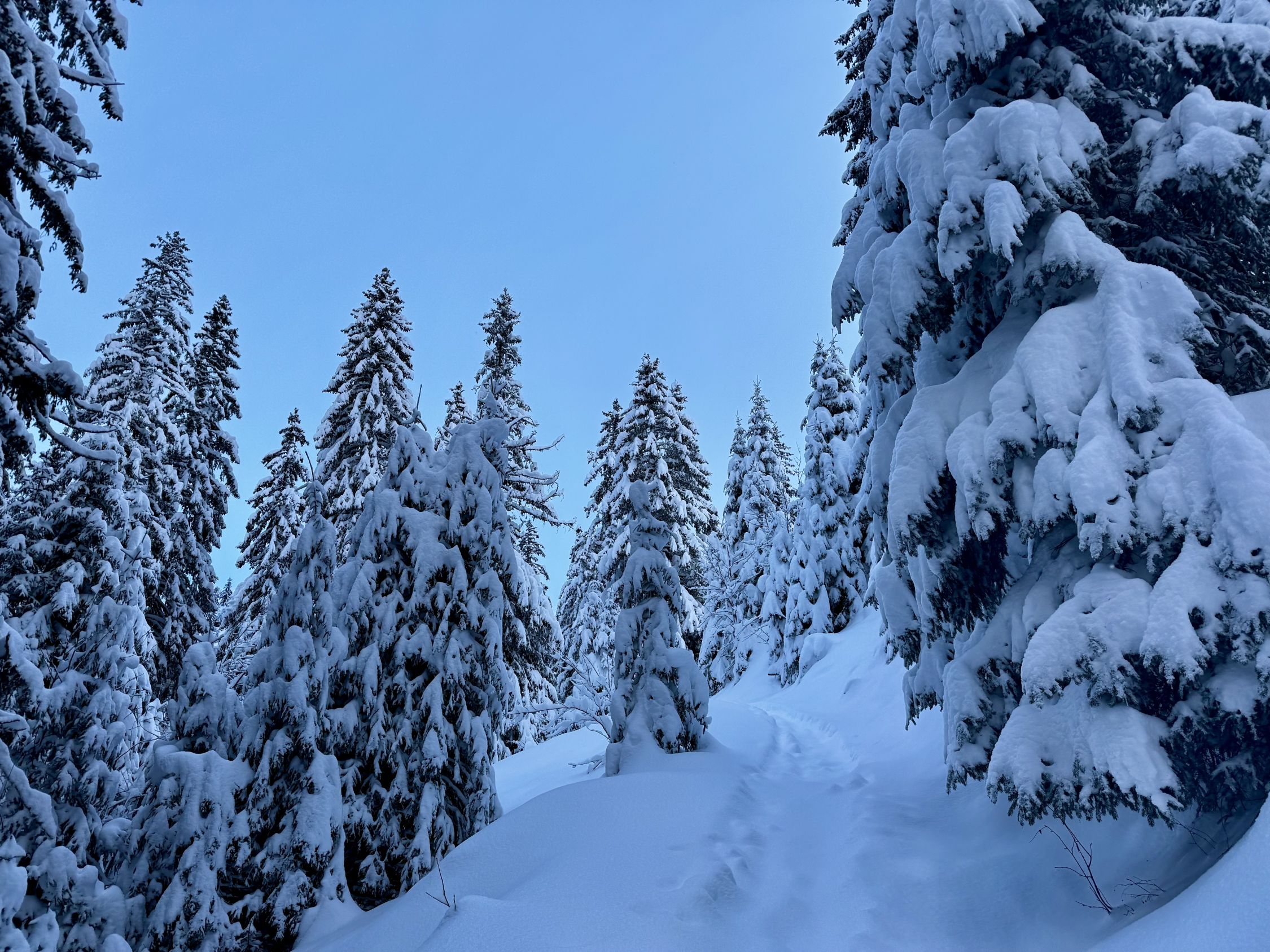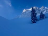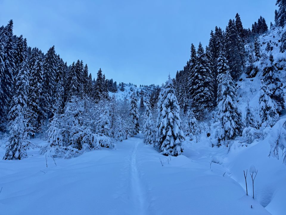 Wie erwartet viel Neuschnee und traumhaft eingeschneite Landschaft. Problemloser Aufstieg durch ein „Winter-Wonderland“ bis Alp Grimmi.