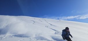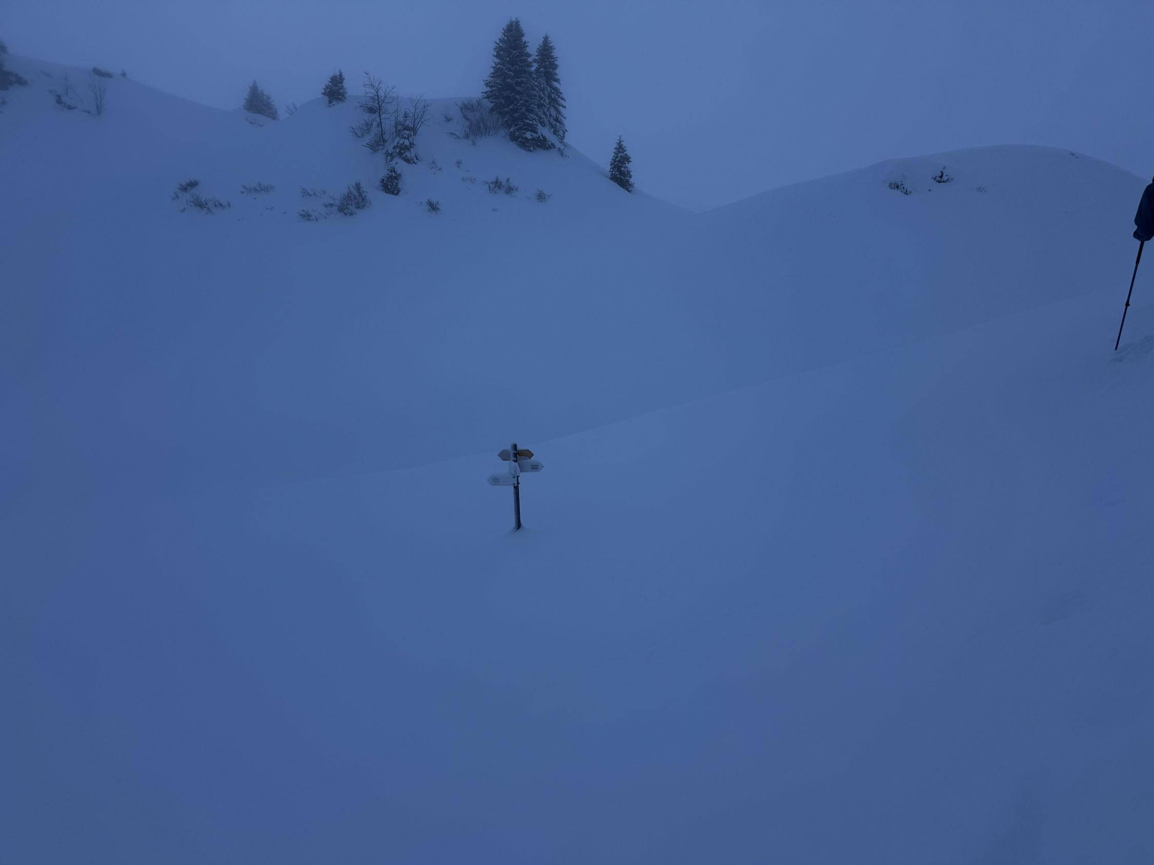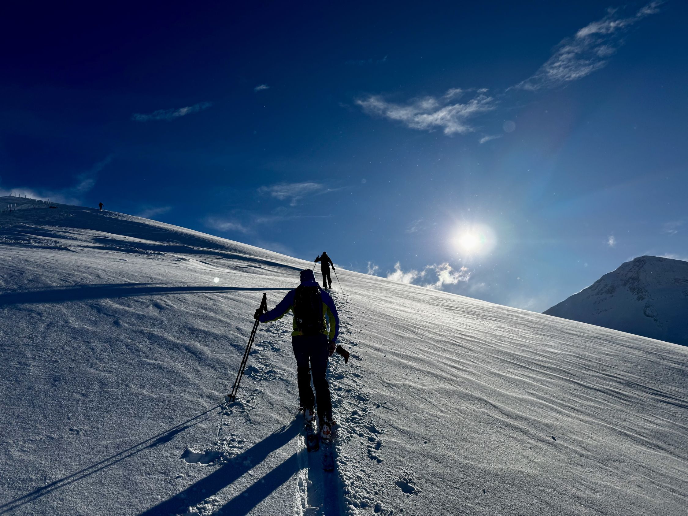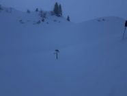 Weiterer Aufstieg in tiefem Pulverschnee problemlos, Spuranlage konsequent entlang den flachen Teilstücken. Keine Warnzeichen wie Wumgeräusche, kleine Rutsche oder spontane Abgänge an den um liegenden steileren Hängen. Weiterführend guter Aufstieg via Grimmigurggi und Gipfelflanke.