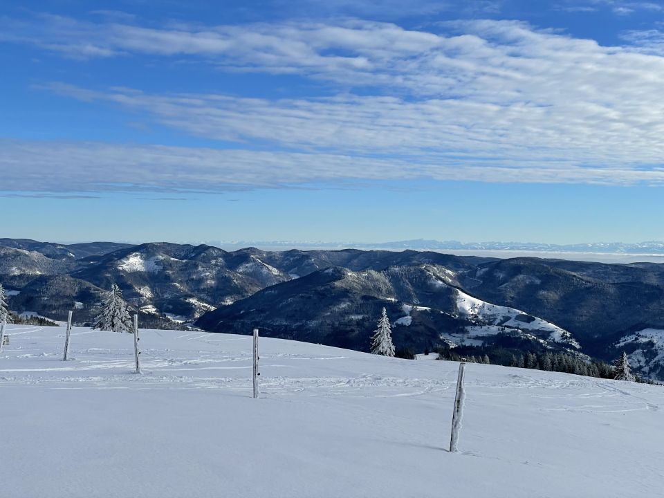 Es hat im Schwarzwald endlich mal wieder richtig geschneit im Hochwinter, ich hätte schon nicht mehr damit gerechnet. Da alle Skigebiete offen haben, war für mich heute eher die Frage, wo finde ich eine Tour mit nicht zu vielen Leuten? Ich entschied mich für diese Tour ab dem PP oberhalb Holzimhaus, die wegen des Flachstücks über die Stuhlsebene nie viele Leute aufweist. Sehr schöner Aufstieg, landschaftlich die schönste Skitour am Belchen. Nur kurz viele Leute bei der Bergstation der Seilbahn, sonst wenige, auch am Gipfel. Abfahrt oben windgeprägt und im Waldstück eher ein Runterkommen statt Fahren. Dann der Latsch über die Stuhlsebene bei wunderschönem Wetter mit entsprechender Aussicht. Der Hang beim Rabenfelsen und die Schlusshänge dann gut bis sehr gut zu fahren, abhängig von Windexposition und Sonneneinstrahlung. Man muss sich das schon im Aufstieg gut anschauen.