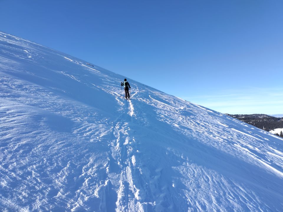Der Aufstieg war sehr windig (windgepresste und abgeblasene Stellen). Gespurt war etwas rechts von der offiziellen Route. Die Schneeverhältnisse der Abfahrt in Richtung Gantrischseeli sind perfekt (Pooowder).