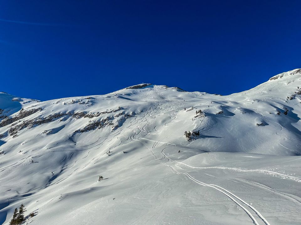 Super Pulverschnee von oben bis unten. Der Gipfelhang war in der Abfahrt traumhaft.