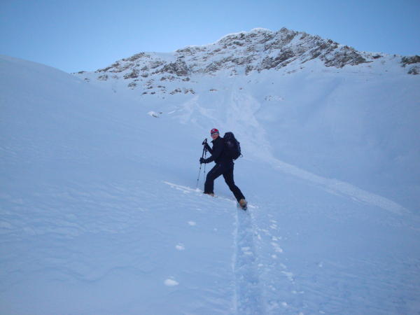 Übliche Route vom Färmeltal hinauf auf den Gipfel. Da die Gefahrenstufe heute eher zu erheblich tendierte, sind wir steil und mit vielen Spitzkehren auf dem Rücken unmittelbar links neben dem Lawinencouloir hinauf. Eine Querung zu den flacheren Hängen war dann weiter oben möglich.