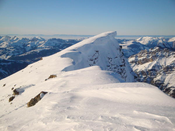 Die "normale" Lawine, die meistens unterhalb des Gipfels abbricht, ist unten. Jedoch hat es immer noch grosse Wächten.