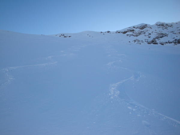 Heute war eine zurückhaltende Spurwahl und eine dauerende Beurteilung der Hänge empfehlenswert. Fällt in den nächsten Tagen Neuschnee, würde ich von der Tour für eine Weile eher abraten, da es auch Schwachschichten in der Schneedecke hat.