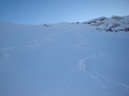 Heute war fast alles anzutreffen: Pulverschnee bis fast zu den Knien, (leichter, teilweiser sogar tragfähiger) Bruchharst, körniger Schnee (auch als eingeschneite Schicht). Daher war eine vorsichtige Routenwahl unumgänglich.