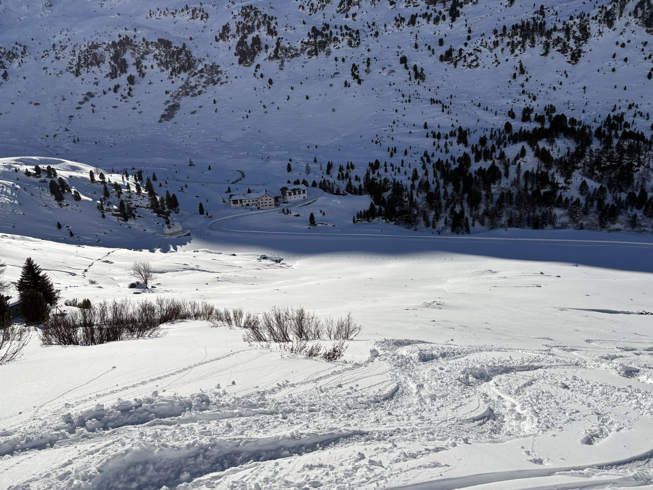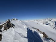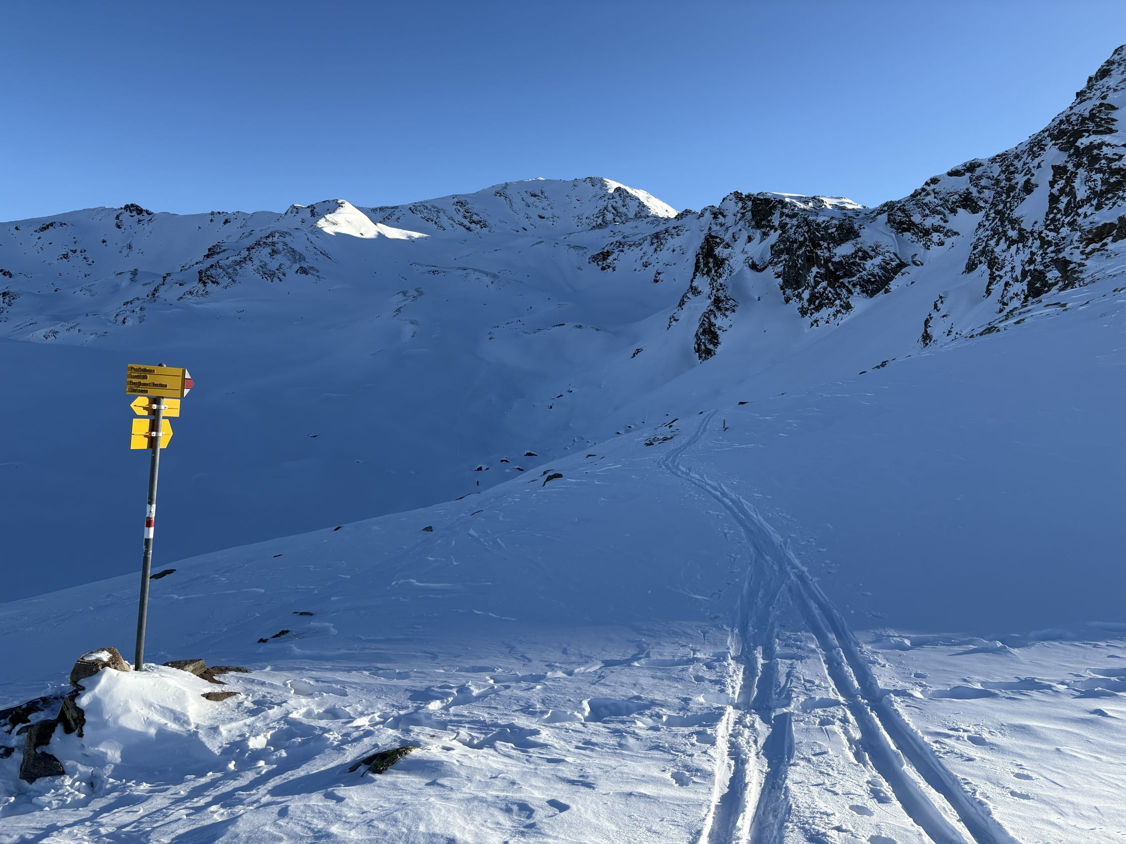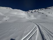 Ab Pischa-Bergbahn gute Spur in Pulver. Aufstieg über Nordflanke verblasen. Snwobaoard mit Harscheisen. Abfahrt in schönstem Pulver und noch nicht verfahren. Waren die dritten auf dem Gipfel. Der Wind hat aber stark geblasen, daher Kuppen teilweise freigelegt. Vorausschauende Routenwahl nötig.