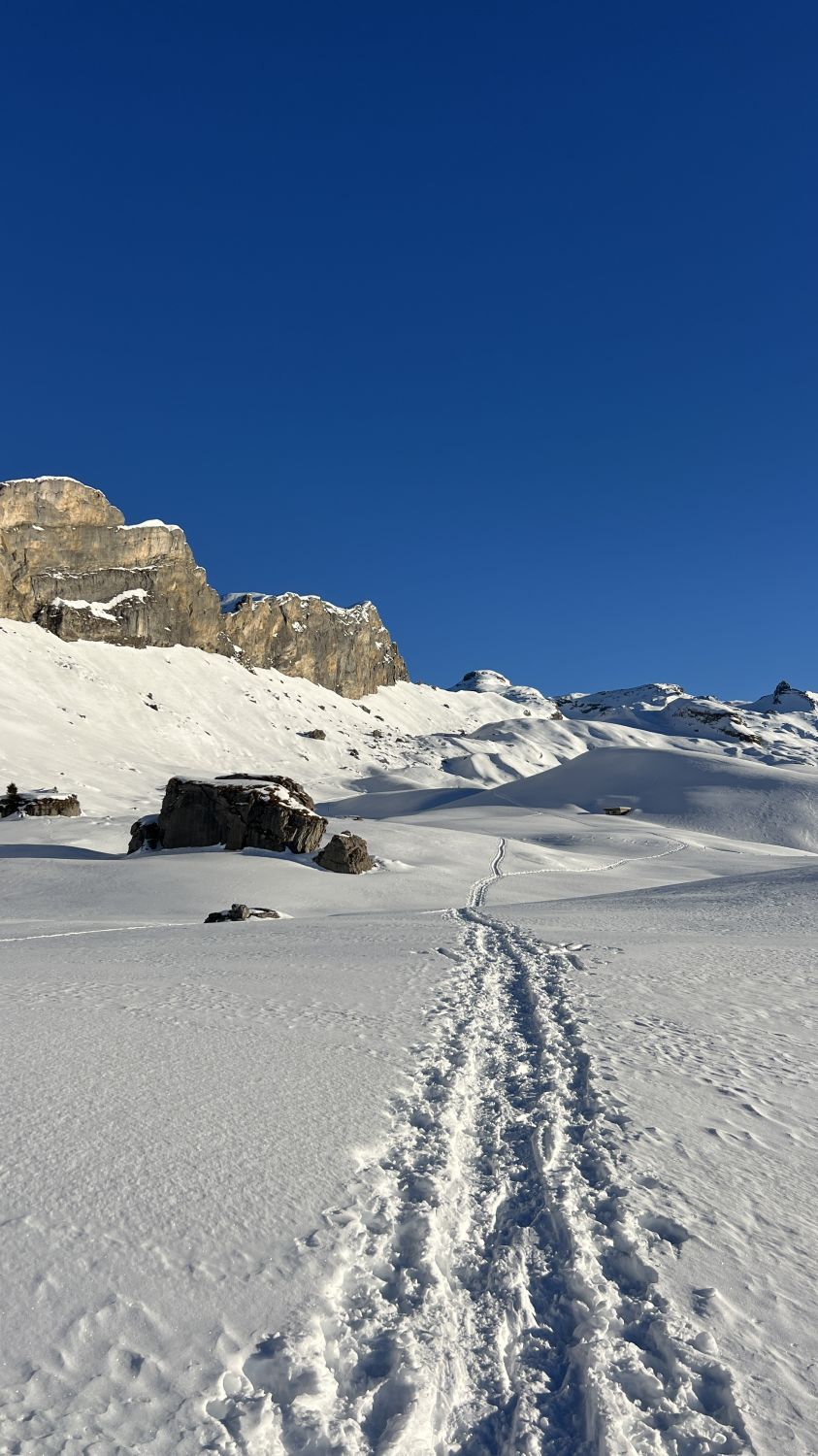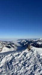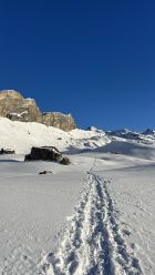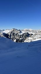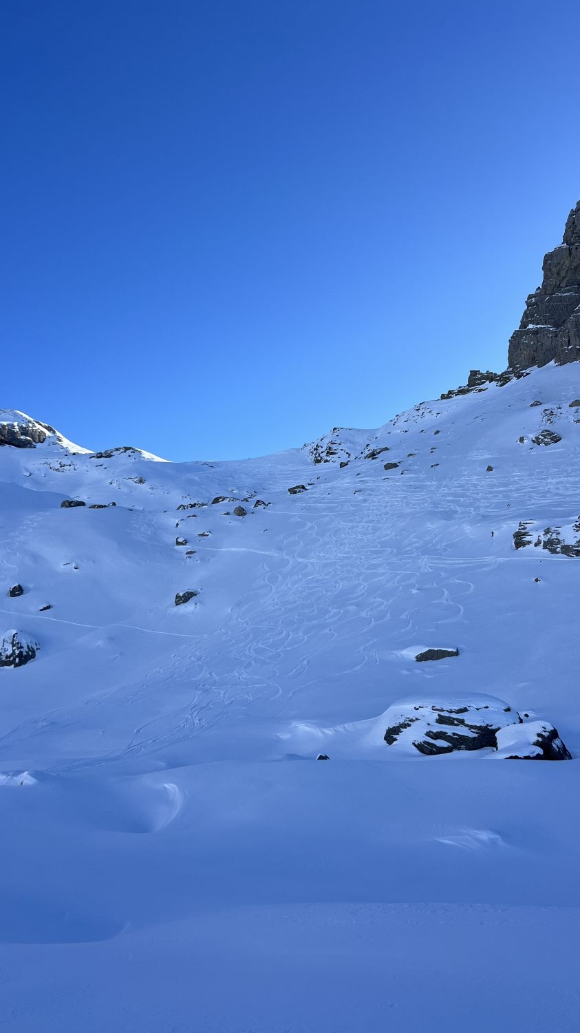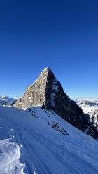 Gute Spur bis zum Gipfel, Harscheisen erleichtern den Aufstieg durch die Südflanke. Abfahrt oben noch Platz für eigene Spuren, braucht aber bereits Fantasie. Unten raus sehr ruppig und alles