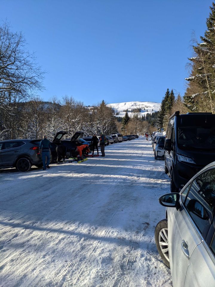 Oben auf dem Plateau strenger Ostwind und wunderbare Alpensicht bis zum Mont-Blanc. Abfahrt zur Todtnauer Hütte und Wiederaufstieg entlang der Loipe.