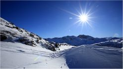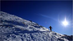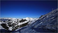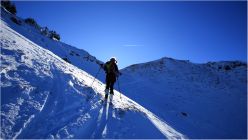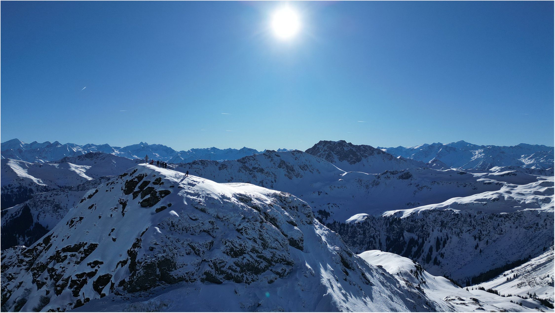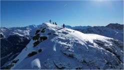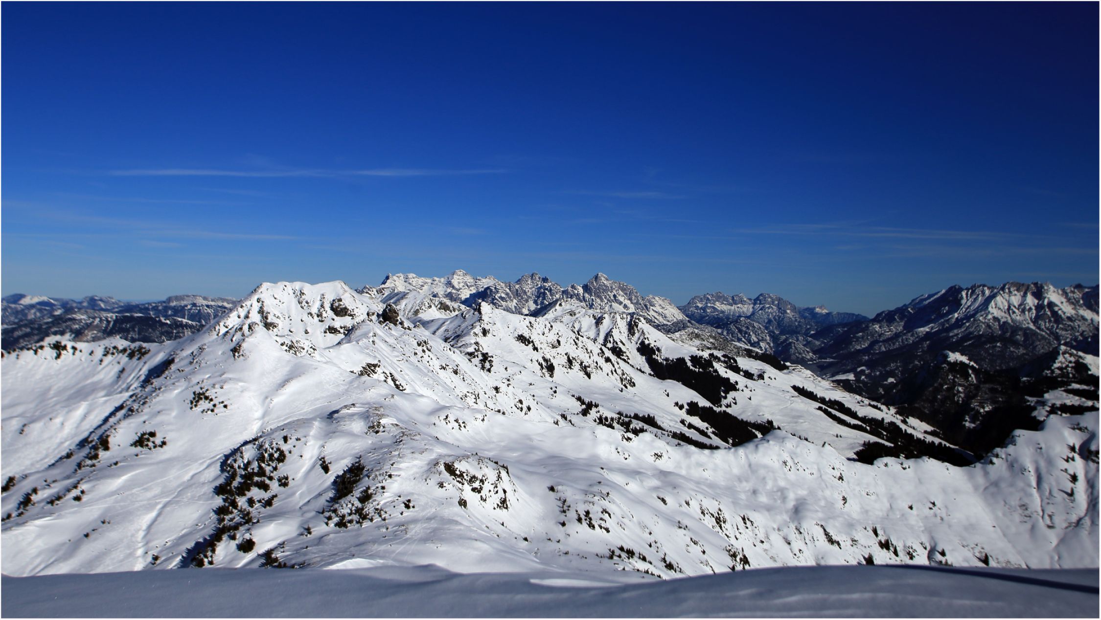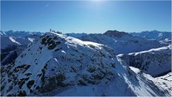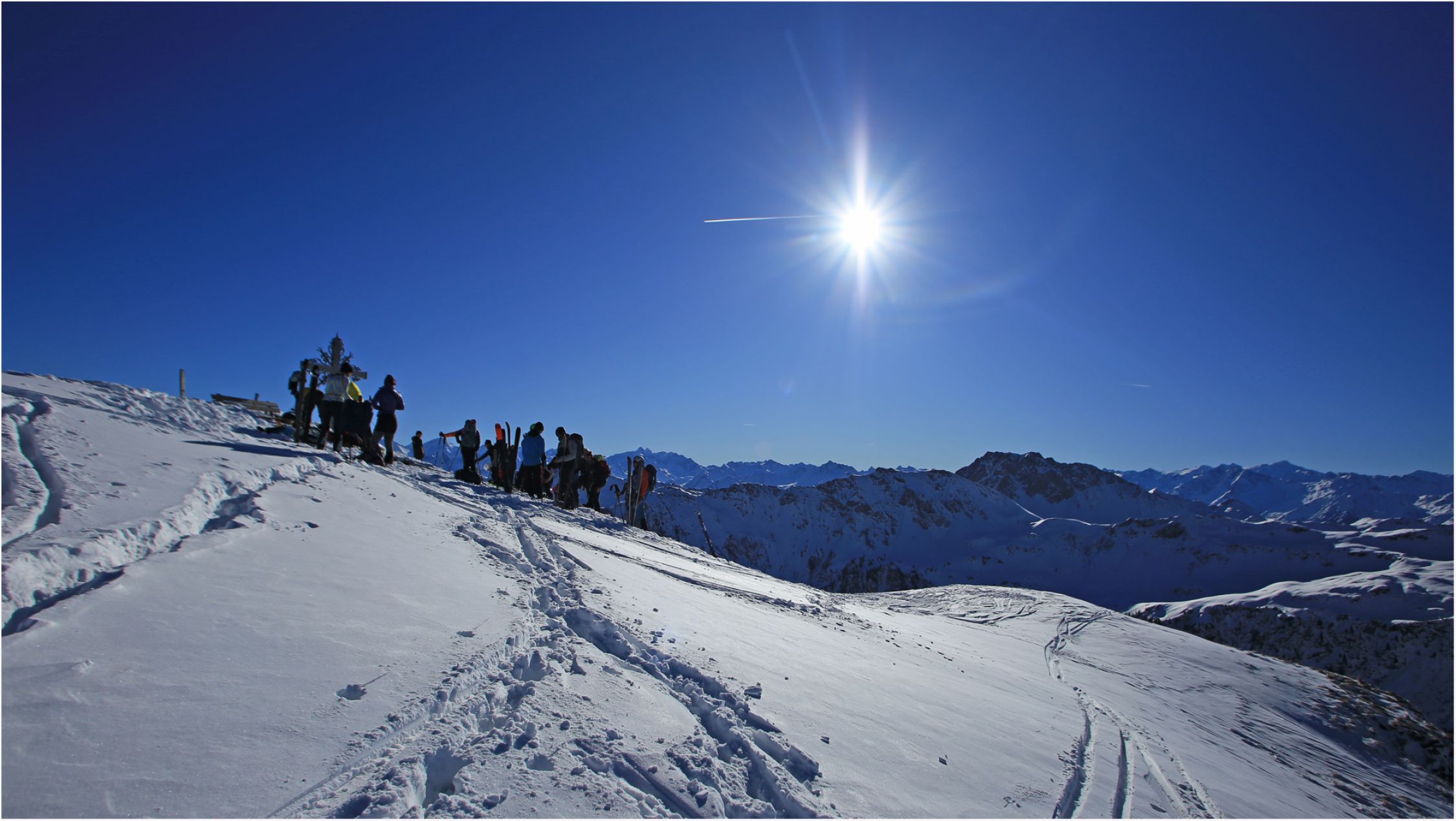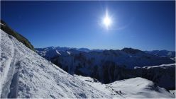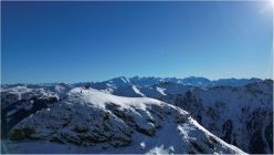 Kaum Wind. Blick in die Runde: Es wurden alle umliegenden Gipfel bestiegen, Schneequalität, soweit anhand der Spuren erkennbar ebenfalls recht unterschiedlich.