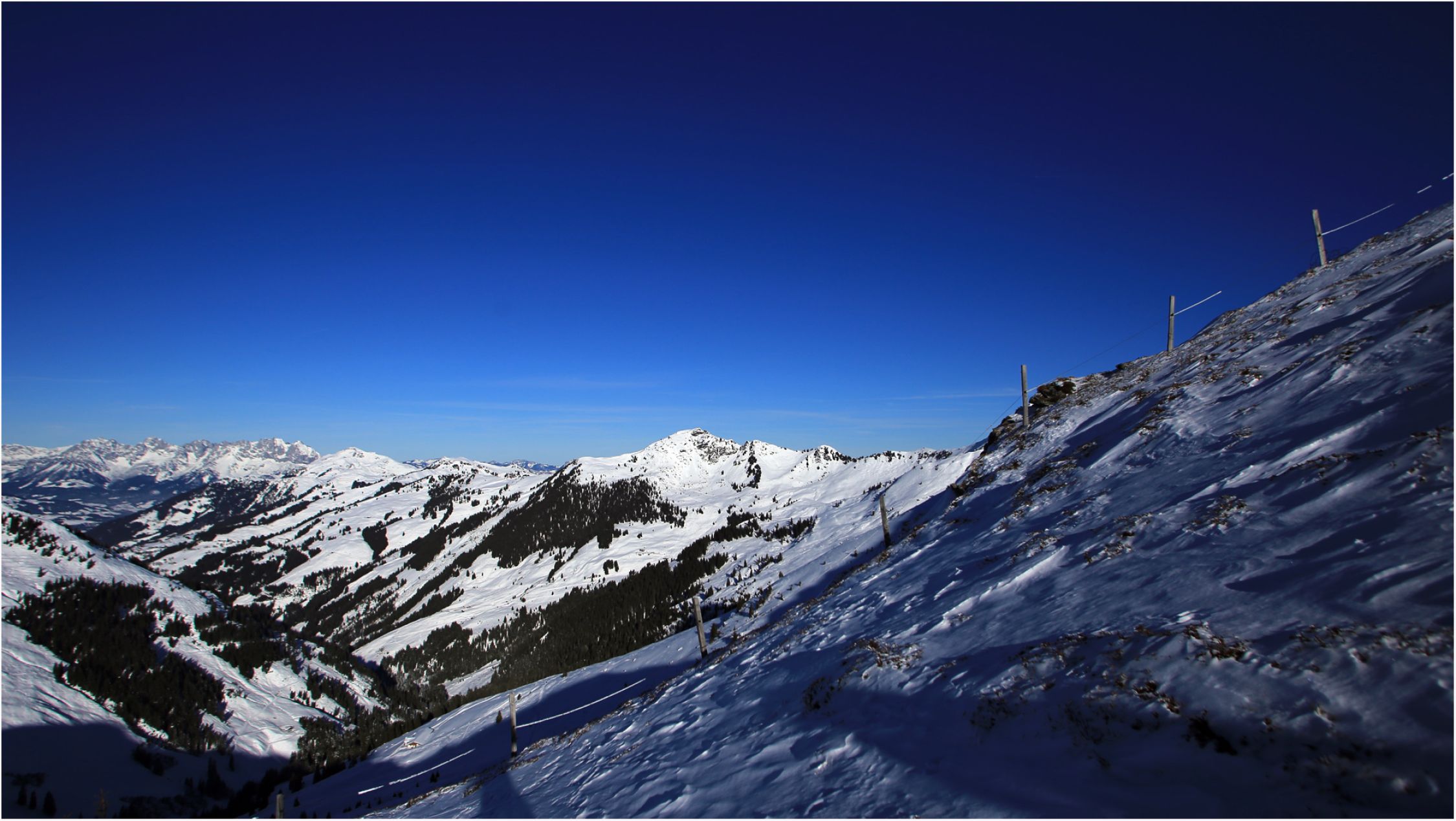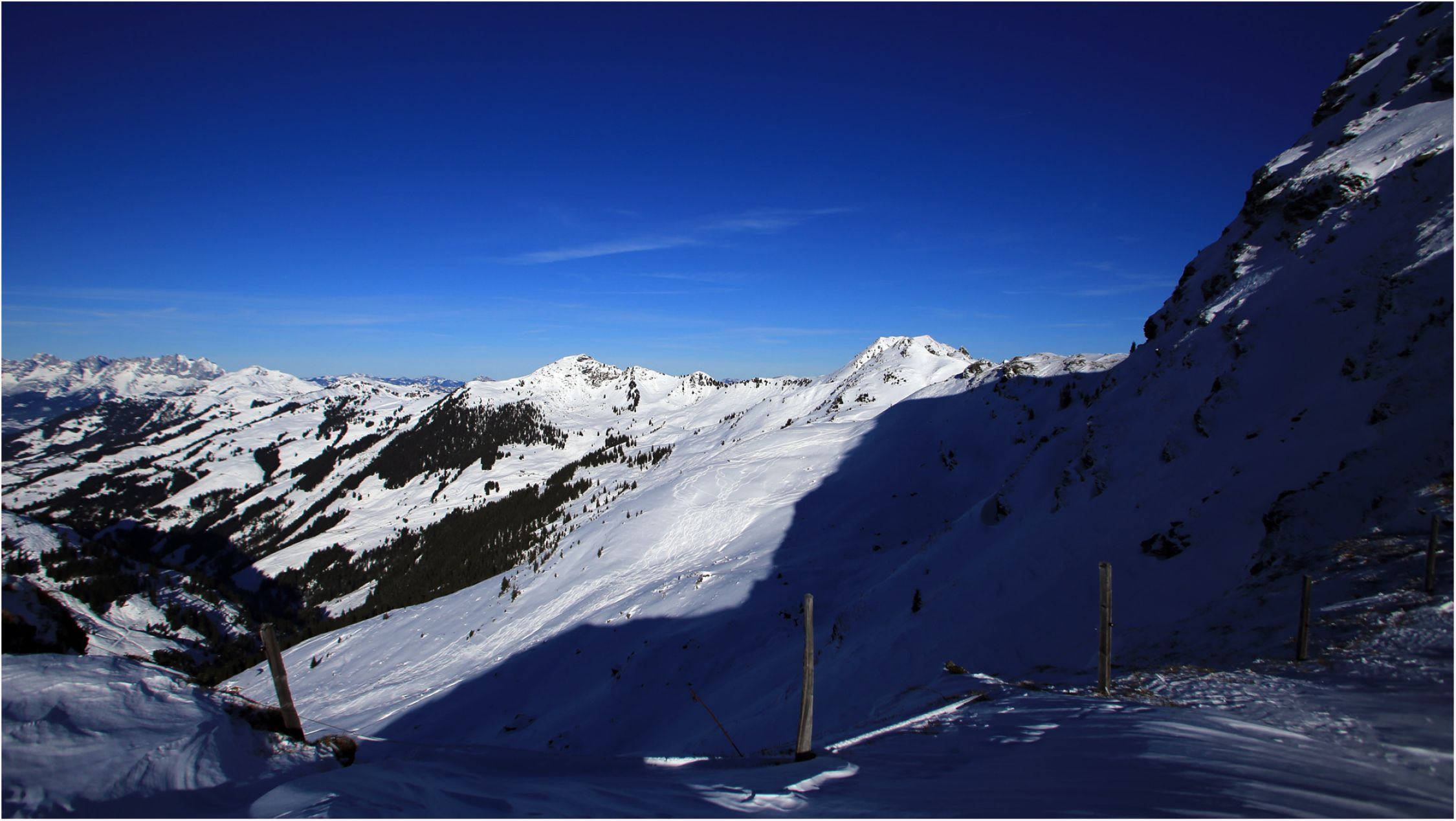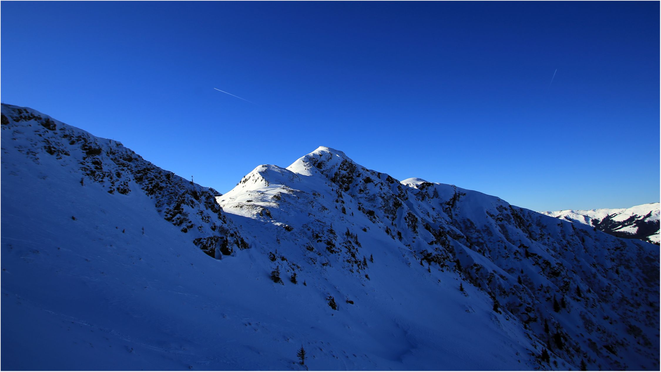Die Schneequalität ist recht druchwachsen, teilweie verblasen, zwischendurch wieder Pulver, im oberen Teil eher rustikal, weildie Sonne schon zugeschlagen hat.