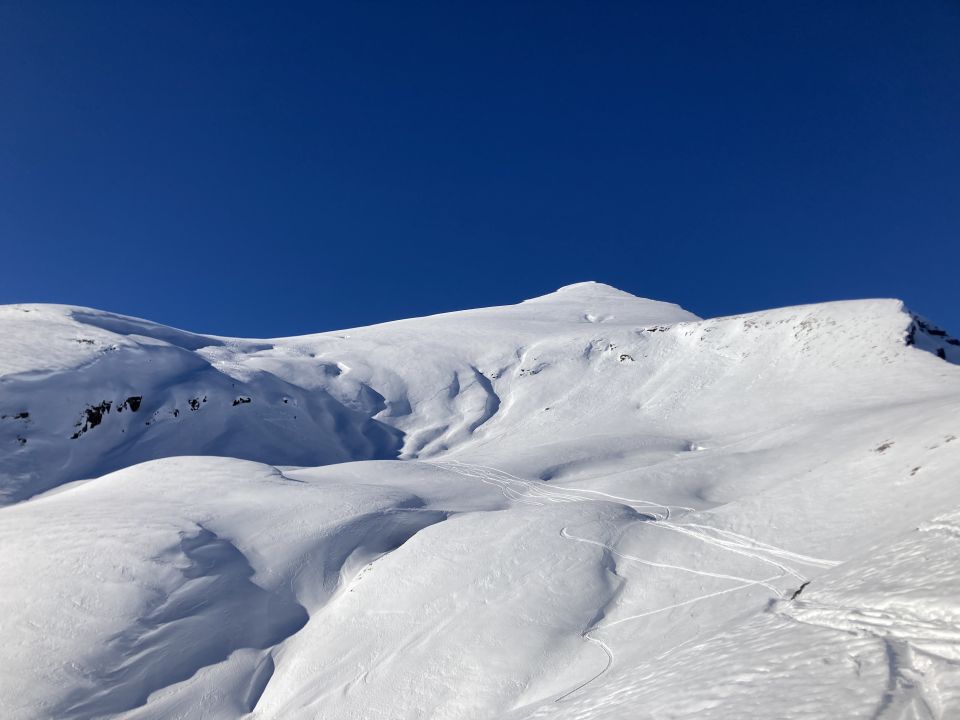 Wir sind am Hotel Wetterhorn gestartet und die Piste Stepfi entlang hoch. Ab 1800m gab es eine Spur Richtung Gemsberg bis auf dem Gipfel (danke für die Arbeit!). Wieder einmal waren wir alleine unterwegs.