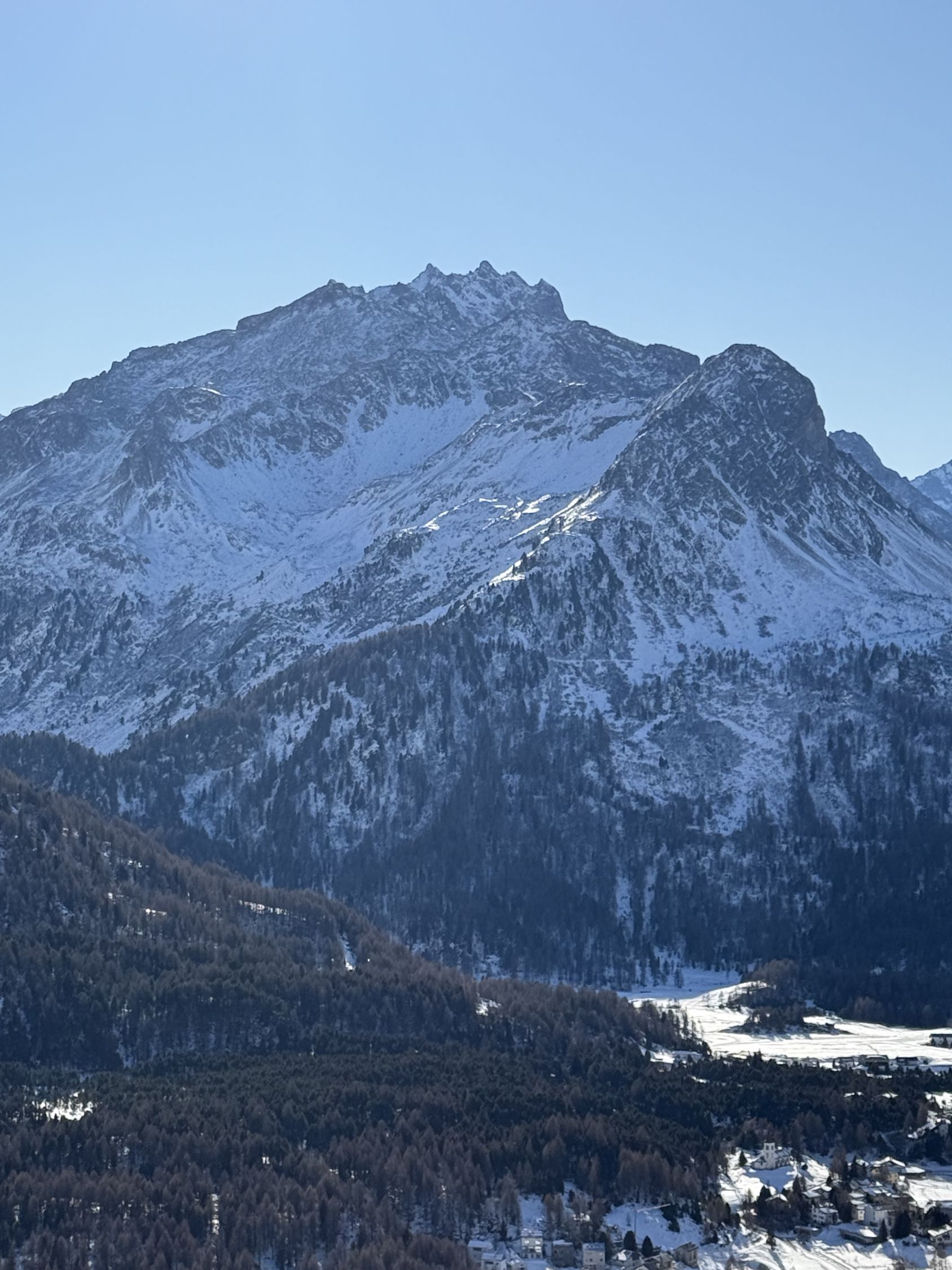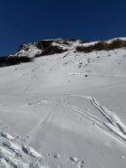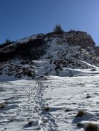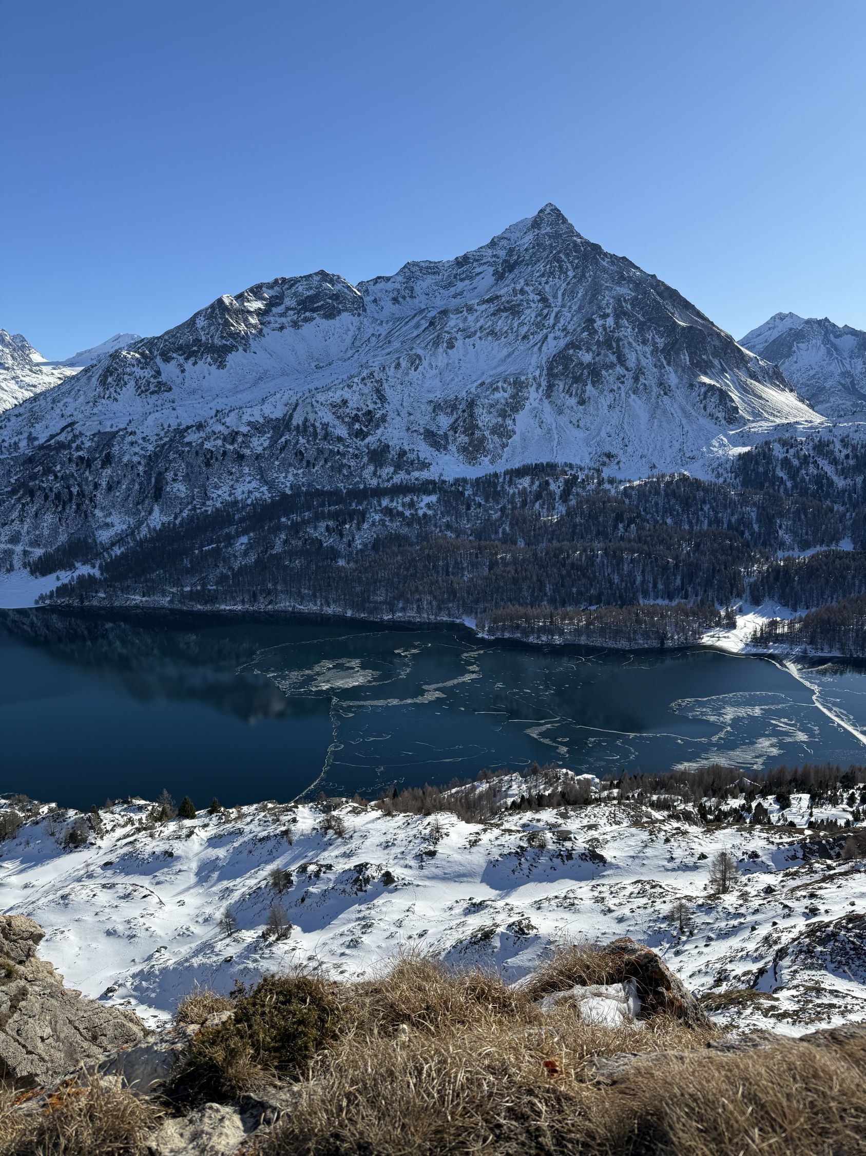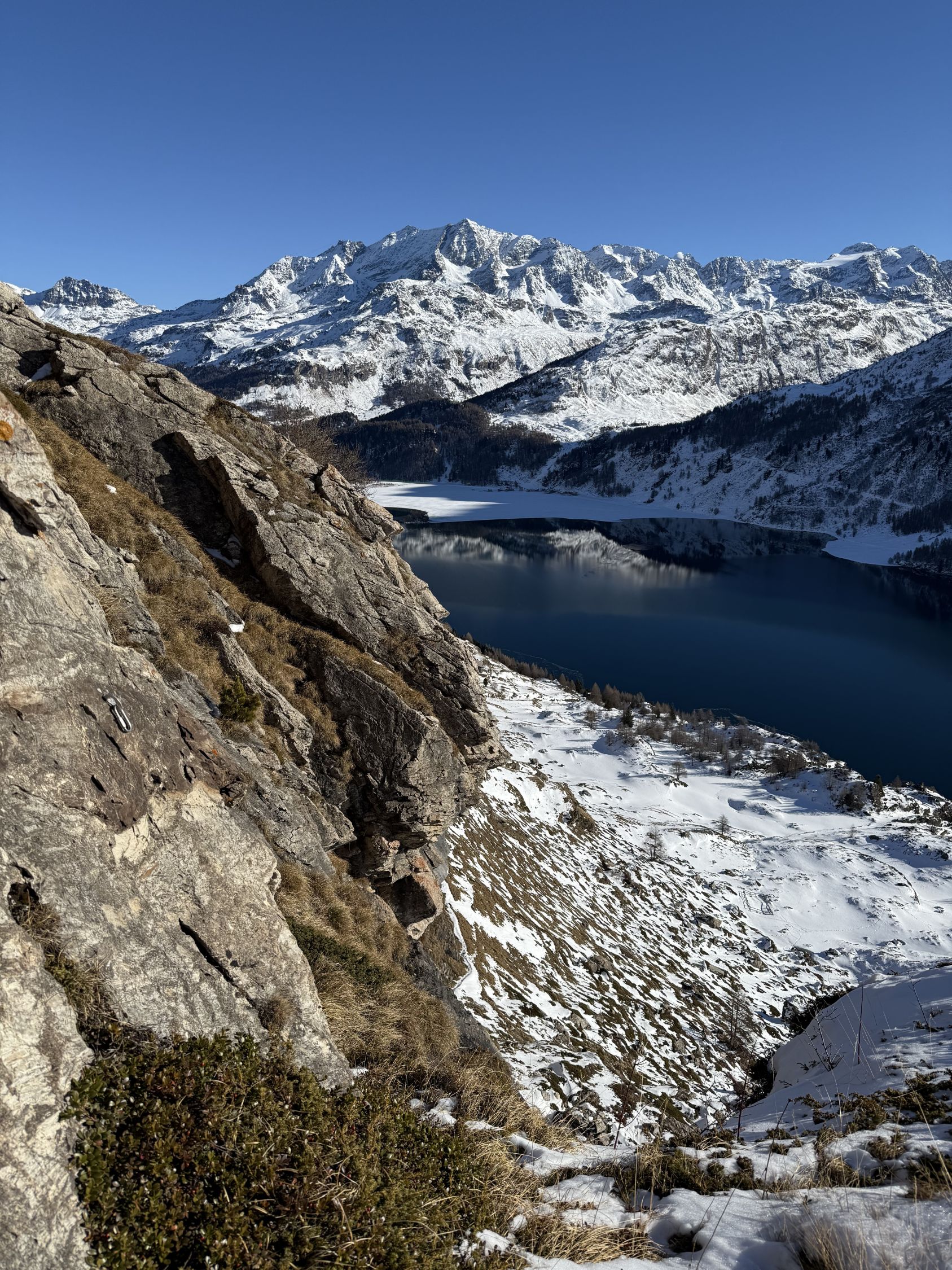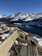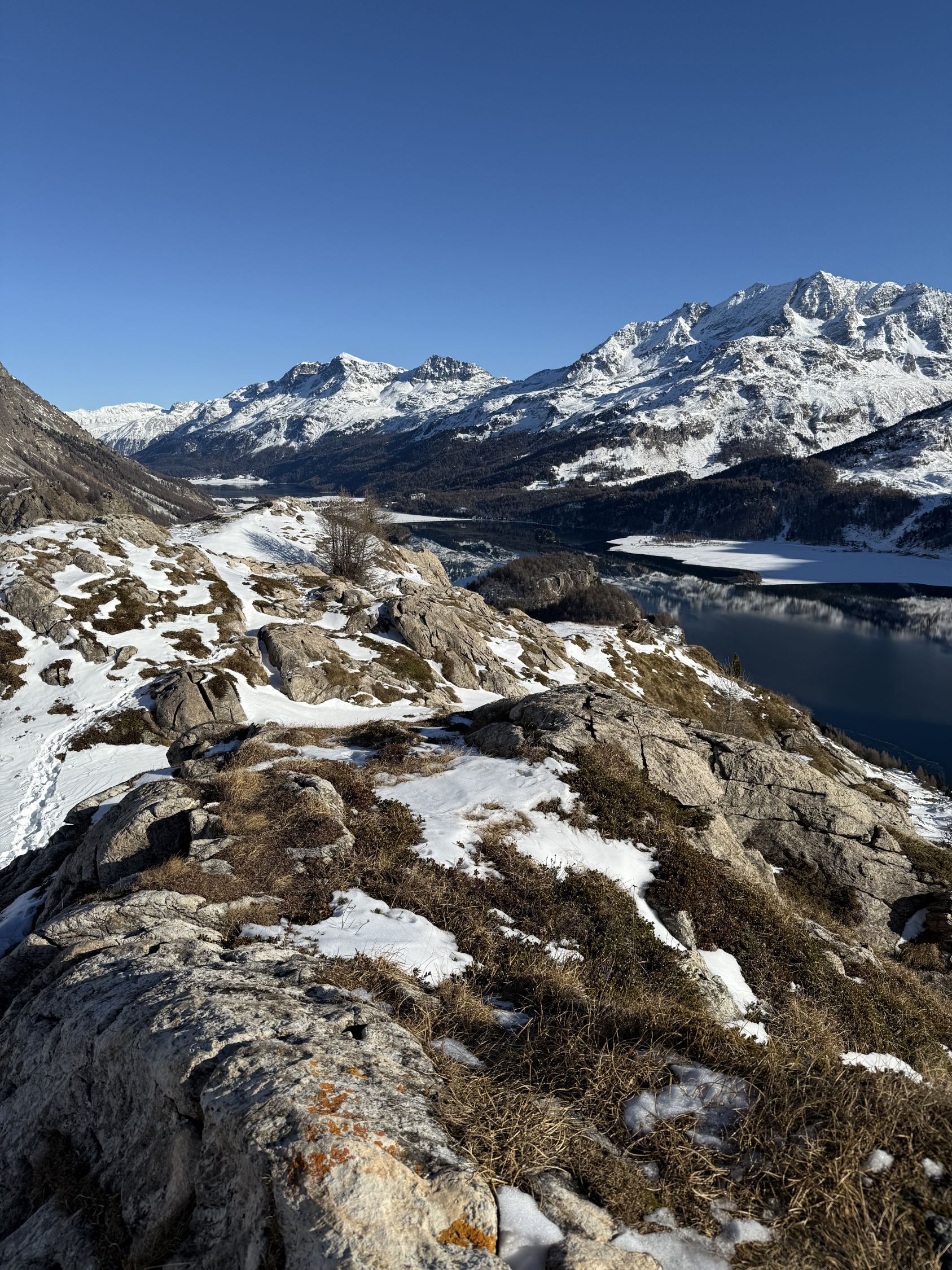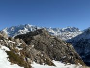 Tour ab Plaun da Lej via Grevasalvas auf das spektakuläre Bänklein über dem Silsersee, T4-. Start Plaun da Lej 10 Uhr, minus 3 Grad, windstill. Wir sind auf guter Spur im Schnee via Grevasalvas nach Blaunca gewandert, T3. Nun steil hoch mit Grädel in der Nordflanke zum Aussichtspunkt. Tolle Rundsicht ins Bergell mit Pizzo Badile und Cengalo und auch zum Piz Tremoggia, T4-. Abstieg wie Aufstieg.