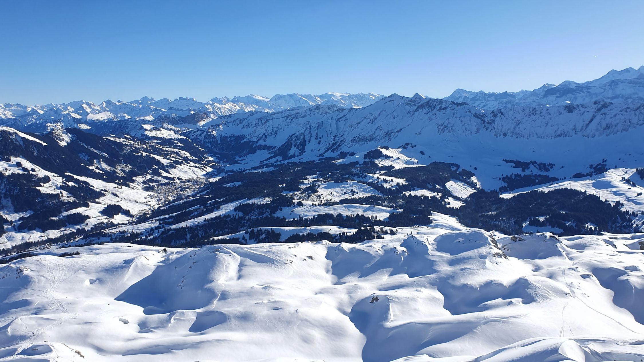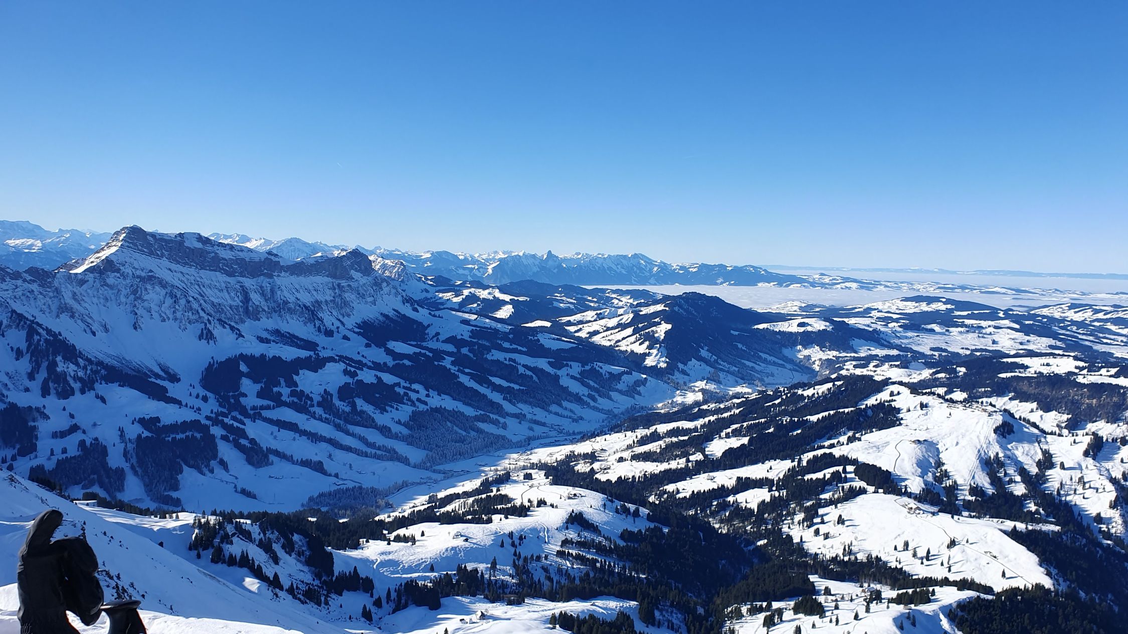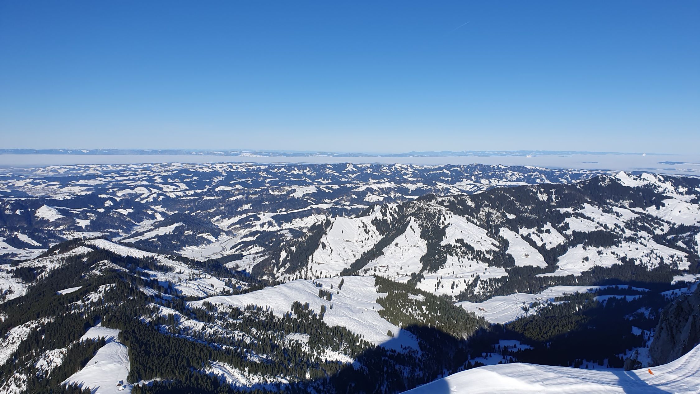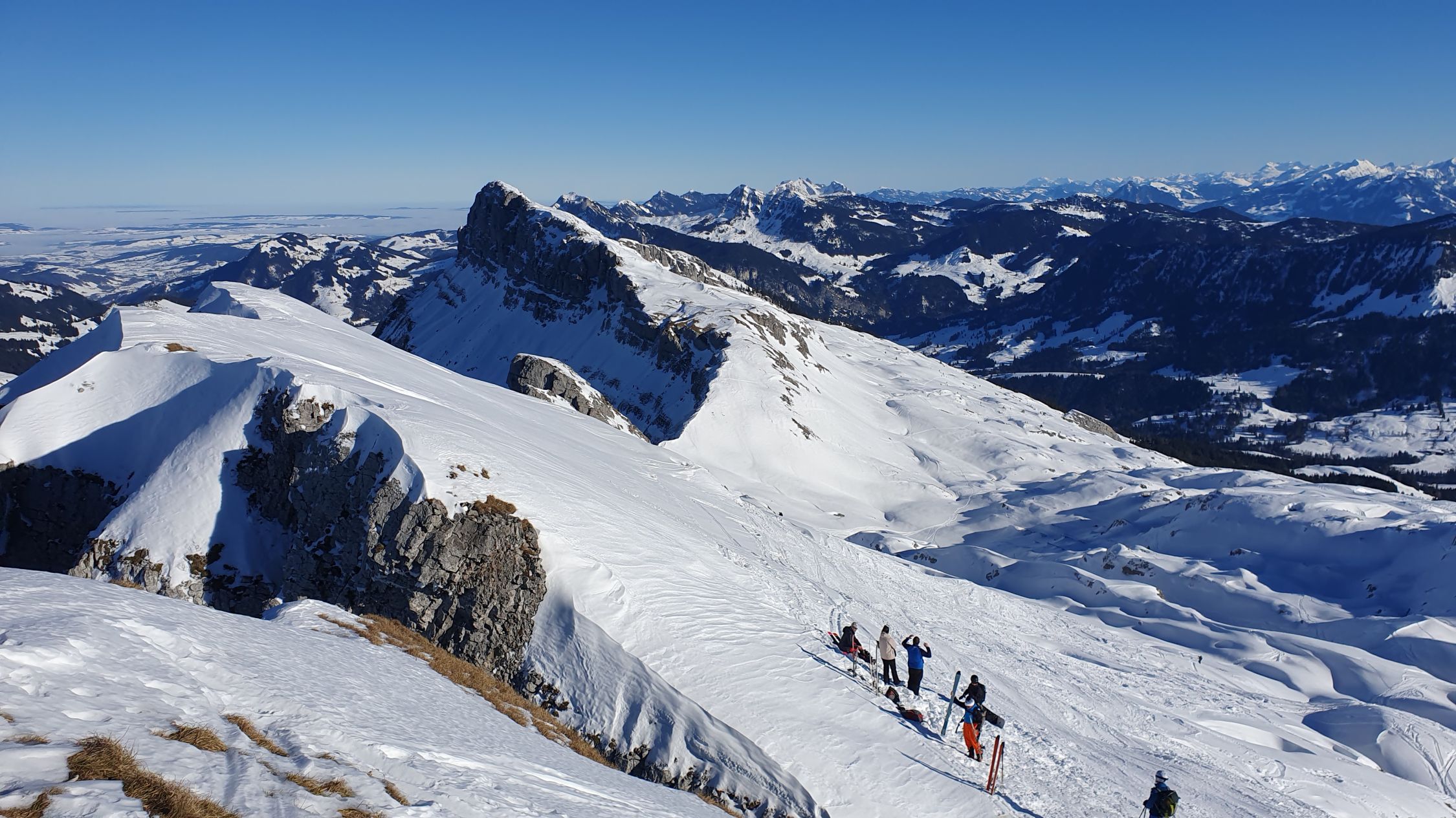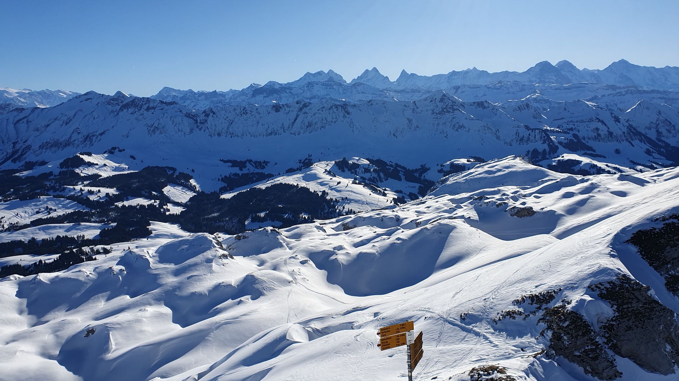 Auf dem Gipfel mild und ausgezeichnete Fernsicht (u.a. EMJ, Aletschhorn, Mont Blanc, Vogesen (Grand Ballon), Schwarzwald (Badisch Blauen, Badisch Belchen, Feldberg), Säntis und natürlich das ganze Alpenpanorama).