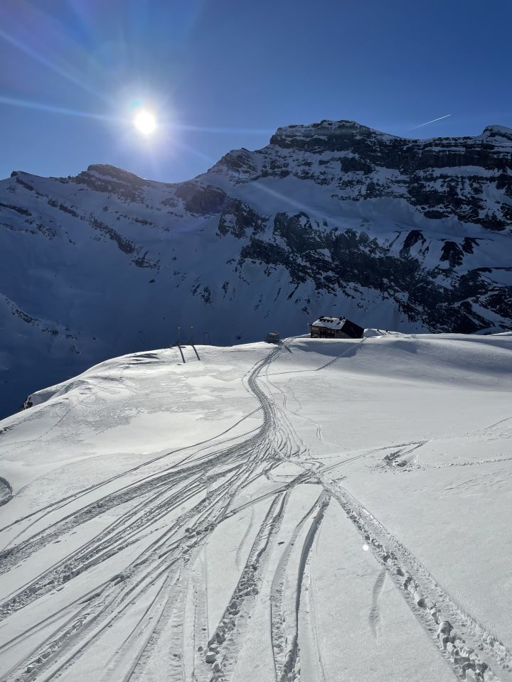 Das Gebiet Lämmern ist schon gut eingeschneit. Sehr gute Spur von Lämmernhütte auf den Mittelgipfel. Nordseitig vom Grosstrubel von Punkt 3090 bis Früstücksplatz ist der Schnee sehr abgeblasen und windgepesst. Frühstückplatztraverse hat noch zu wenig verfestigter Schnee. (Siehe Photo) Flyschweng hat gesetzter schöner Pulverschnee. Drei Türeler waren heute von Engstligenalp Richtung Grosstrubel unterwegs.