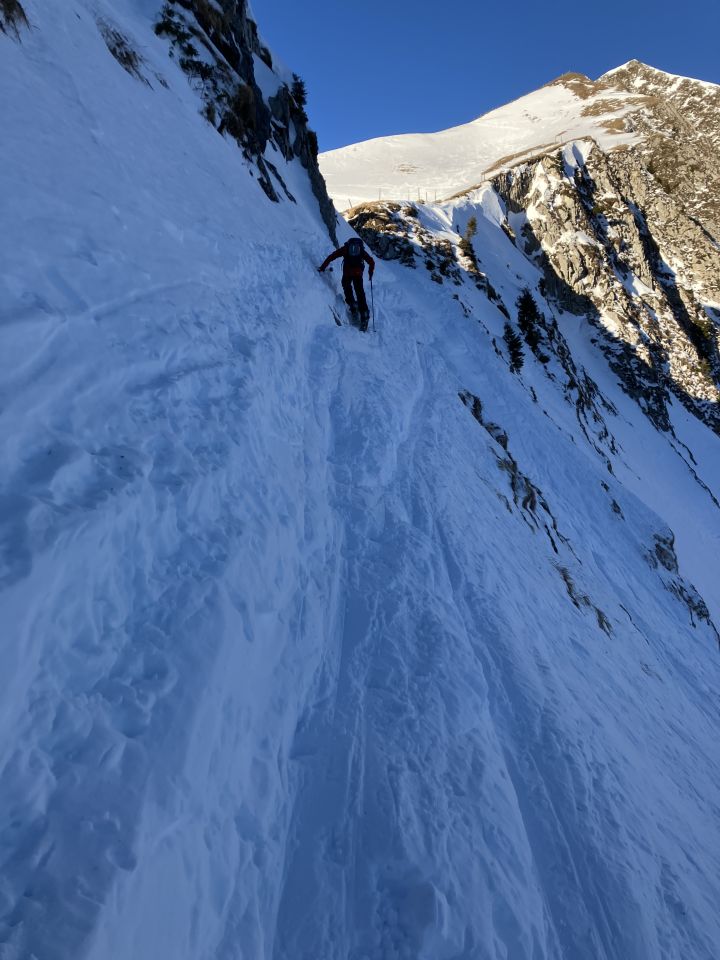 Gute Spur bis Gipfel. Auf Südseite morgens die Spur eisig/glasig.