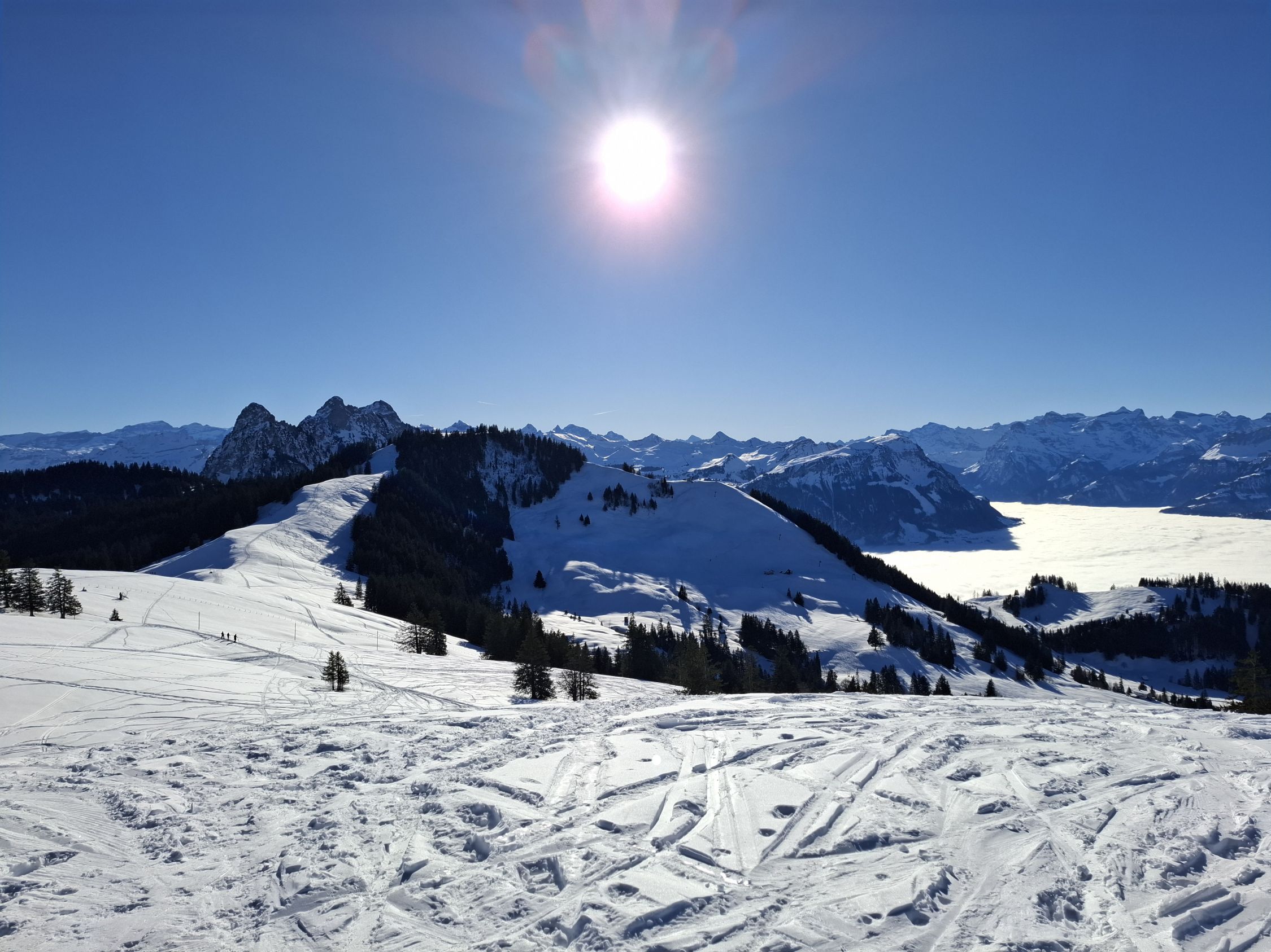 Die Brücke beim Parkplatz ist gesperrt. Man muss zuerst einige Meter die Piste rauf, dann links abbiegen. Beim Aufstieg ab Mostelberg dachten wir, eine Abfahrt sei kaum mehr möglich: Alles war mit grossen Tritten von Schneeschuhgängern übersät, und der Schnee war ruppig. Am Gipfel (ca. 12 Uhr) waren wir beide die einzigen Skitourenfahrer, alles andere waren Schneeschuhläufer*innen. Bei der Abfahrt fuhren wir zum Bärenfang und dann über die ehemalige Hochstuckli-Abfahrt nach Mostelberg. Von da an (immer möglichst westlich haltend) Richtung Hinterweid - Feldbacheren (lauter, aber harmloser Hund) zur Talstation Sattel. War grandios!