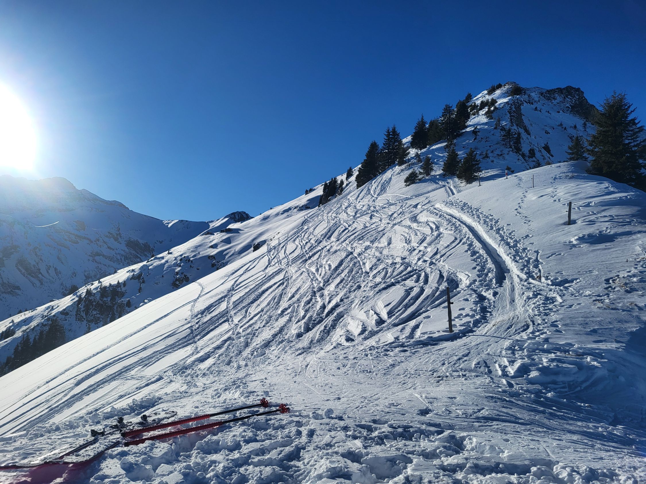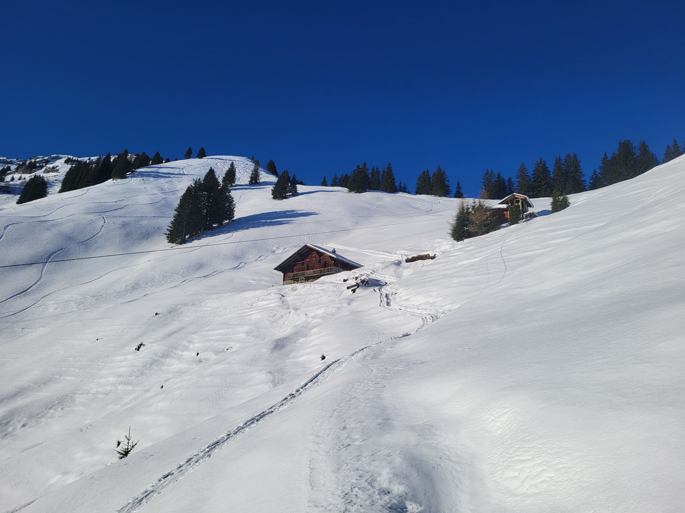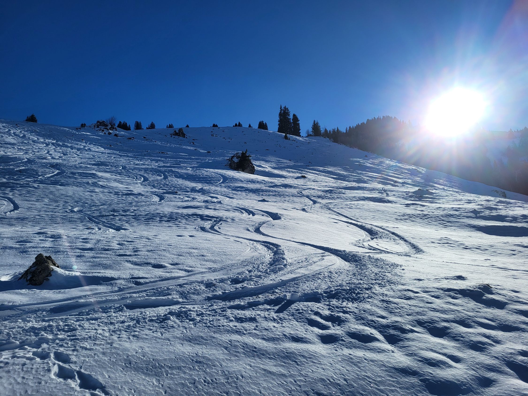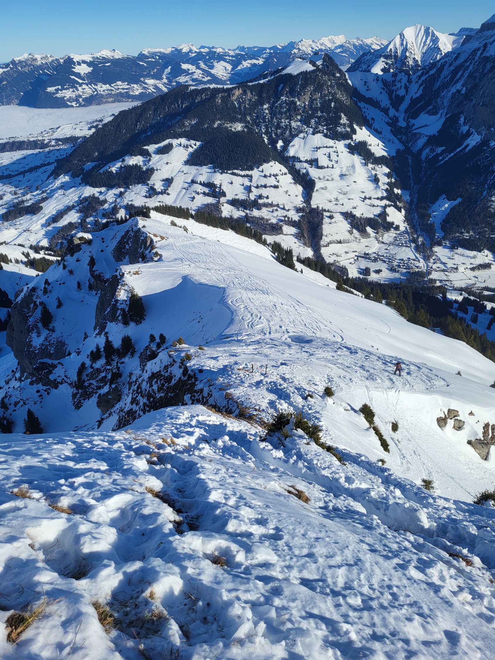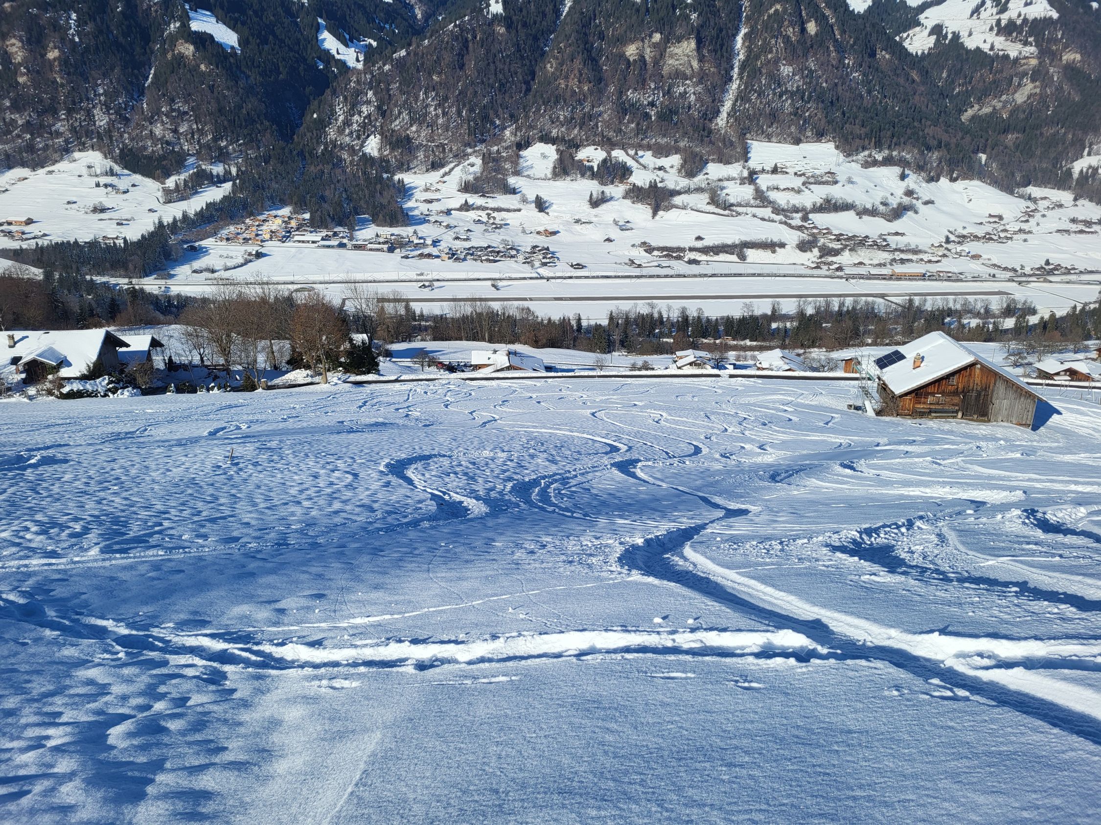 Abfahrt zur Alp Ober Geerenen und dann zu Punkt 1541 mit super Pulverschnee. Bei Stubeweid und Bärgere wird der Schnee etwas knapp, aber keine Steinkontakte. Problemlos auf schneebedeckter Bergstrasse durch den Wald und dann über die Weiden nach Kien. Auch dort ist der Schnee teilweise nicht mehr tief, ging aber problemlos.