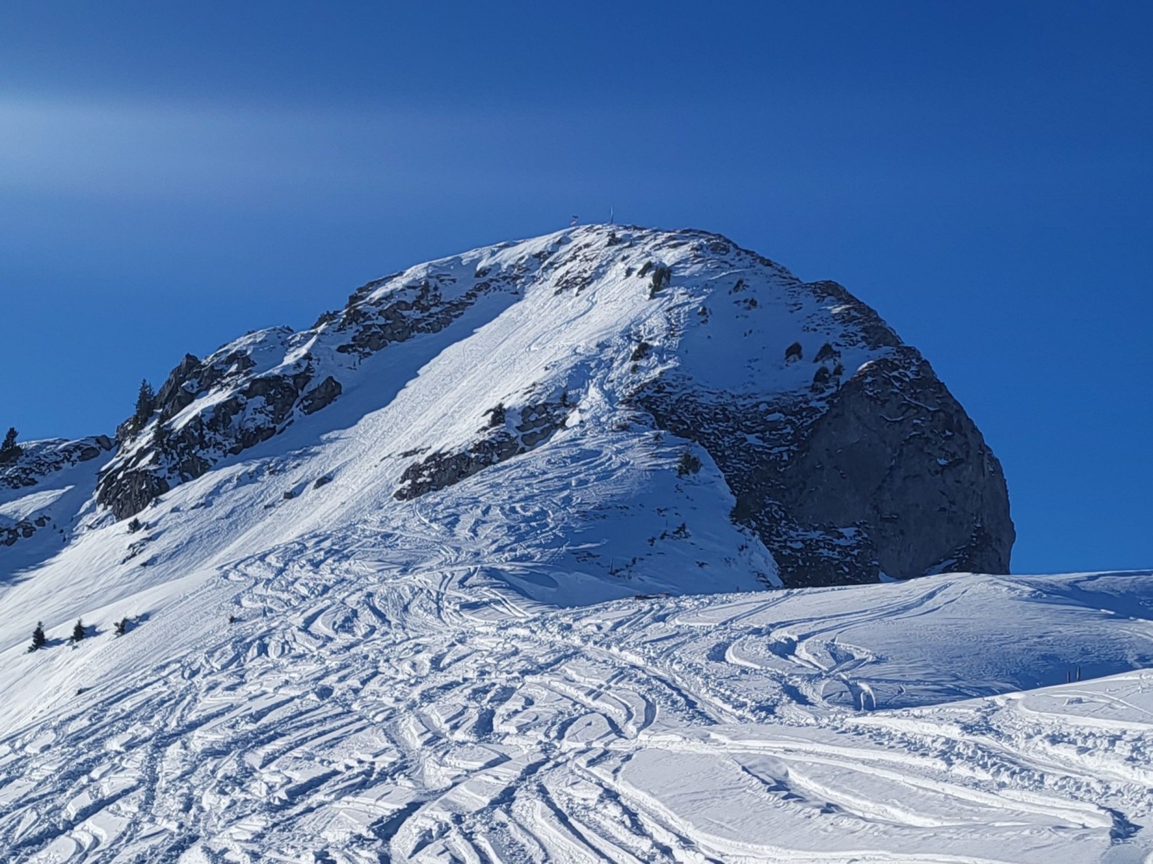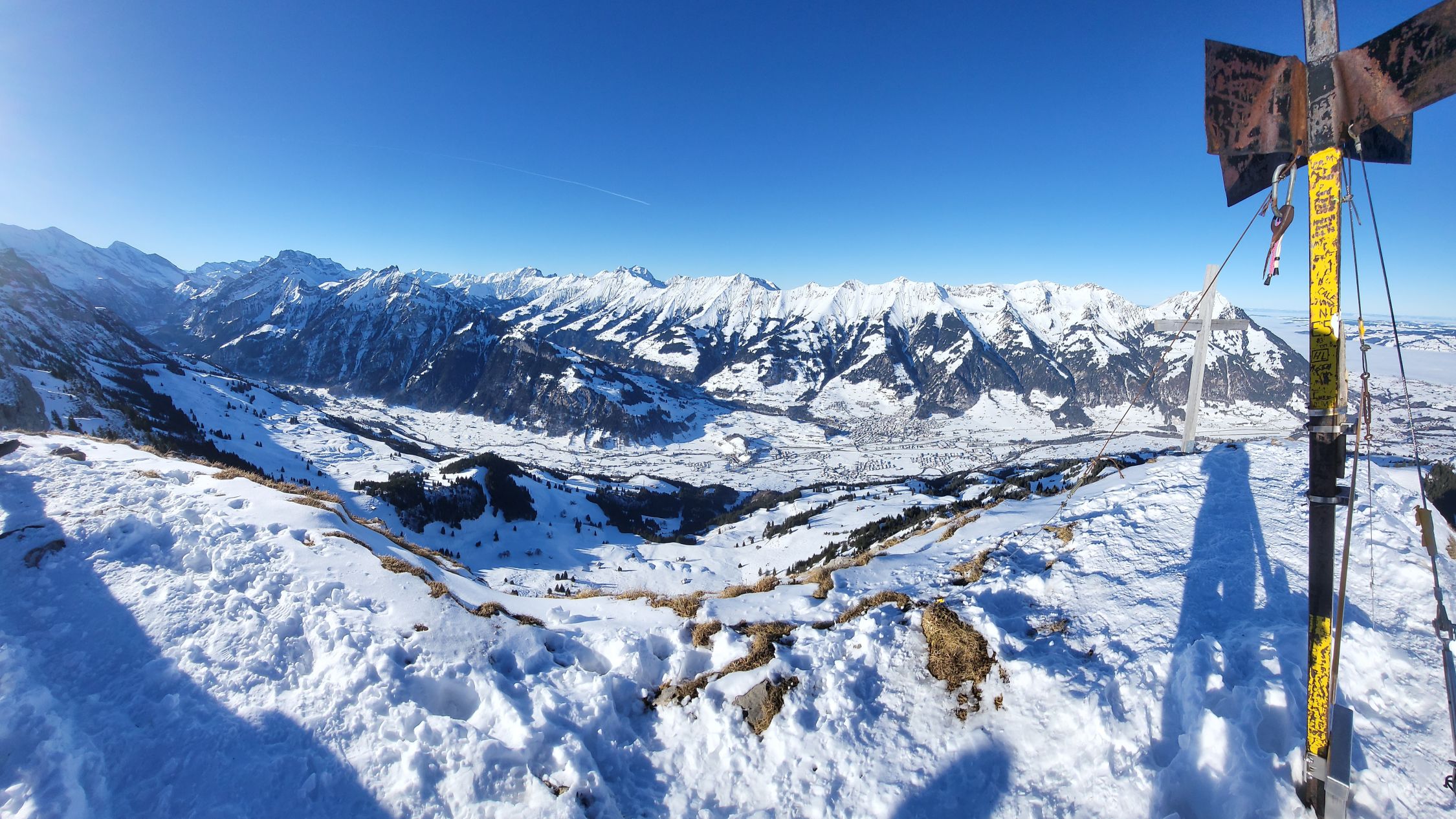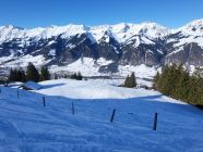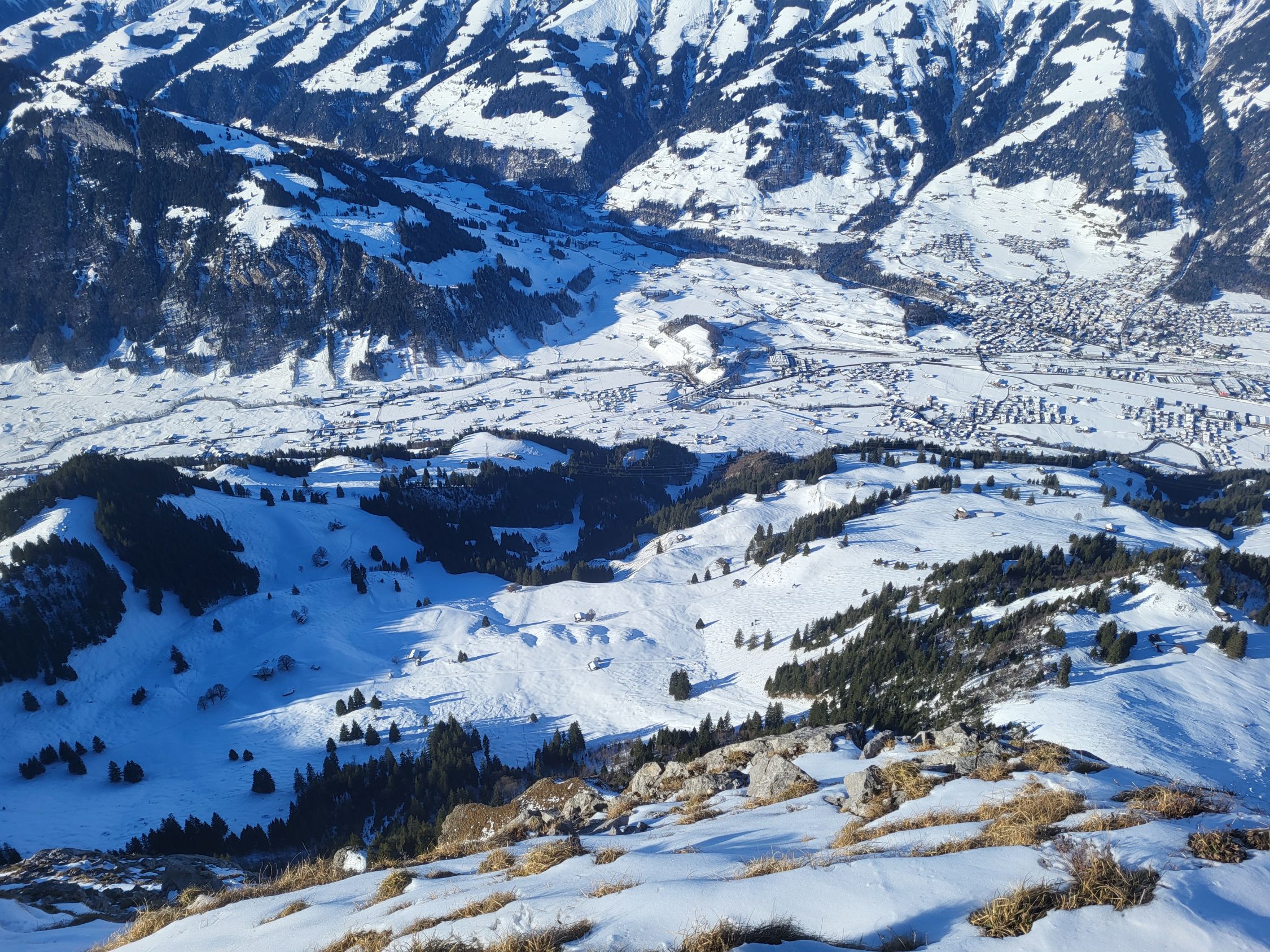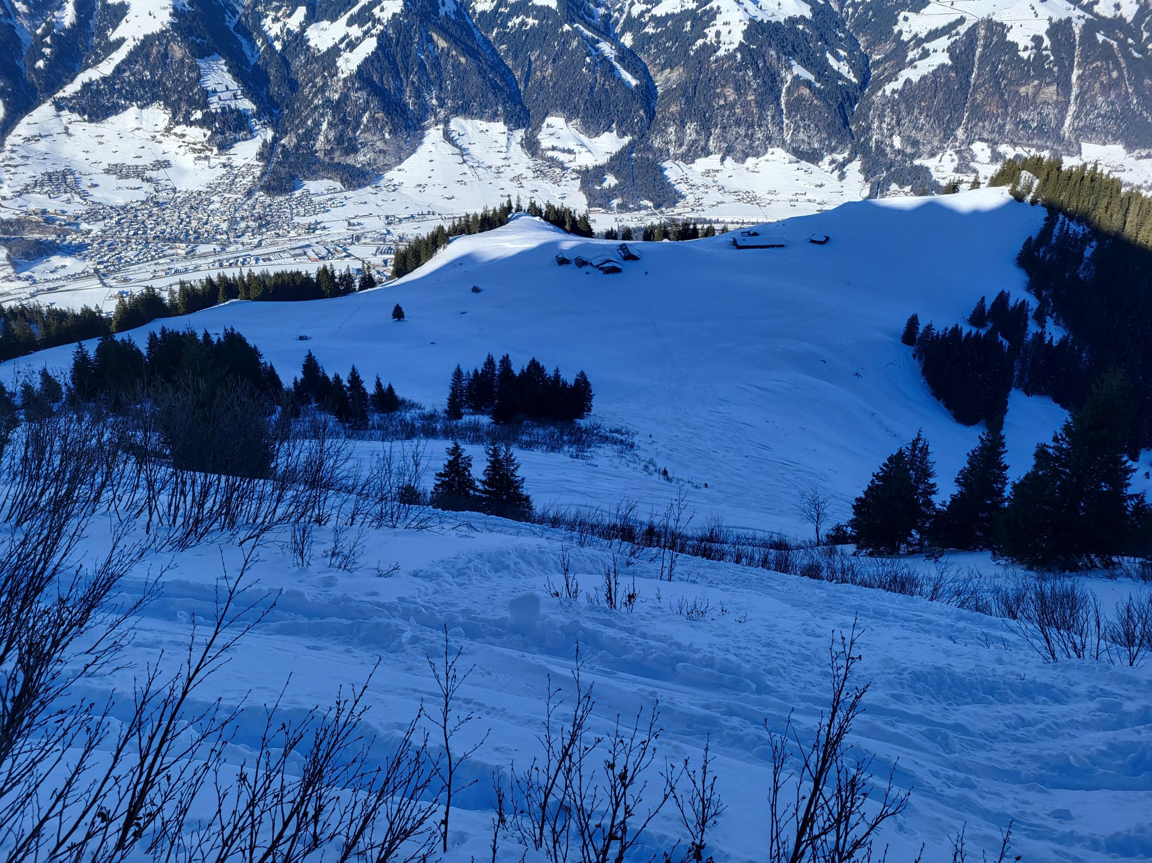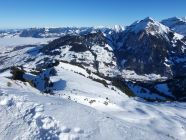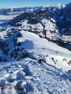 Abfahrt zur Alp Ober Geerenen und dann zu Punkt 1541 mit super Pulverschnee. Bei Stubeweid und Bärgere wird der Schnee etwas knapp, aber keine Steinkontakte. Problemlos auf schneebedeckter Bergstrasse durch den Wald und dann über die Weiden nach Kien. Auch dort ist der Schnee teilweise nicht mehr tief, ging aber problemlos.