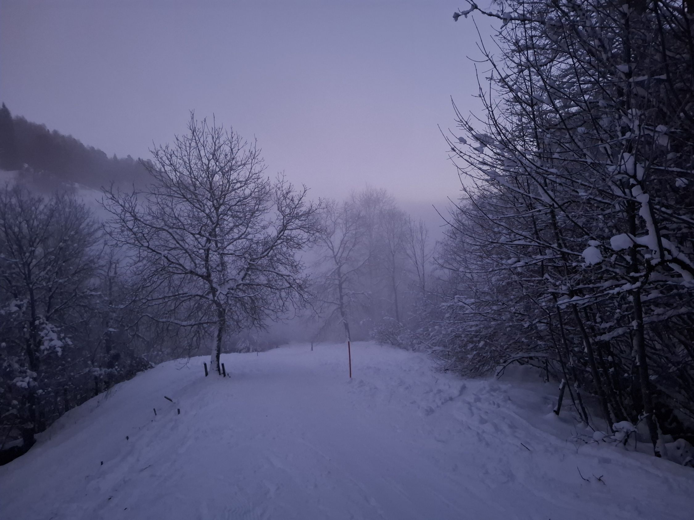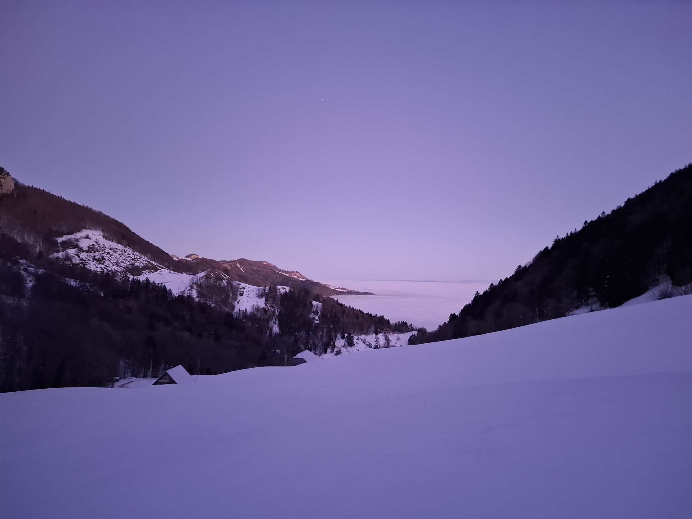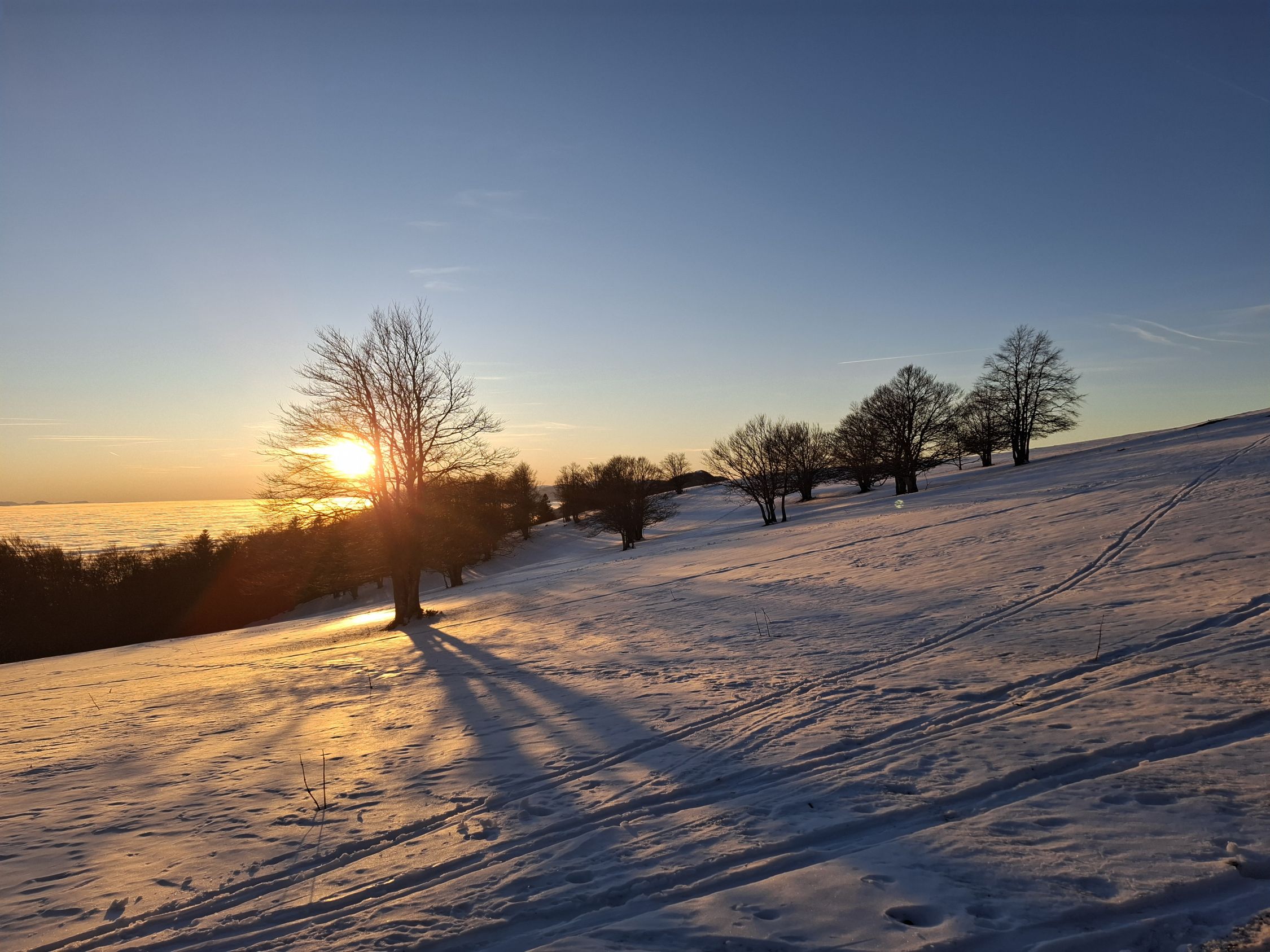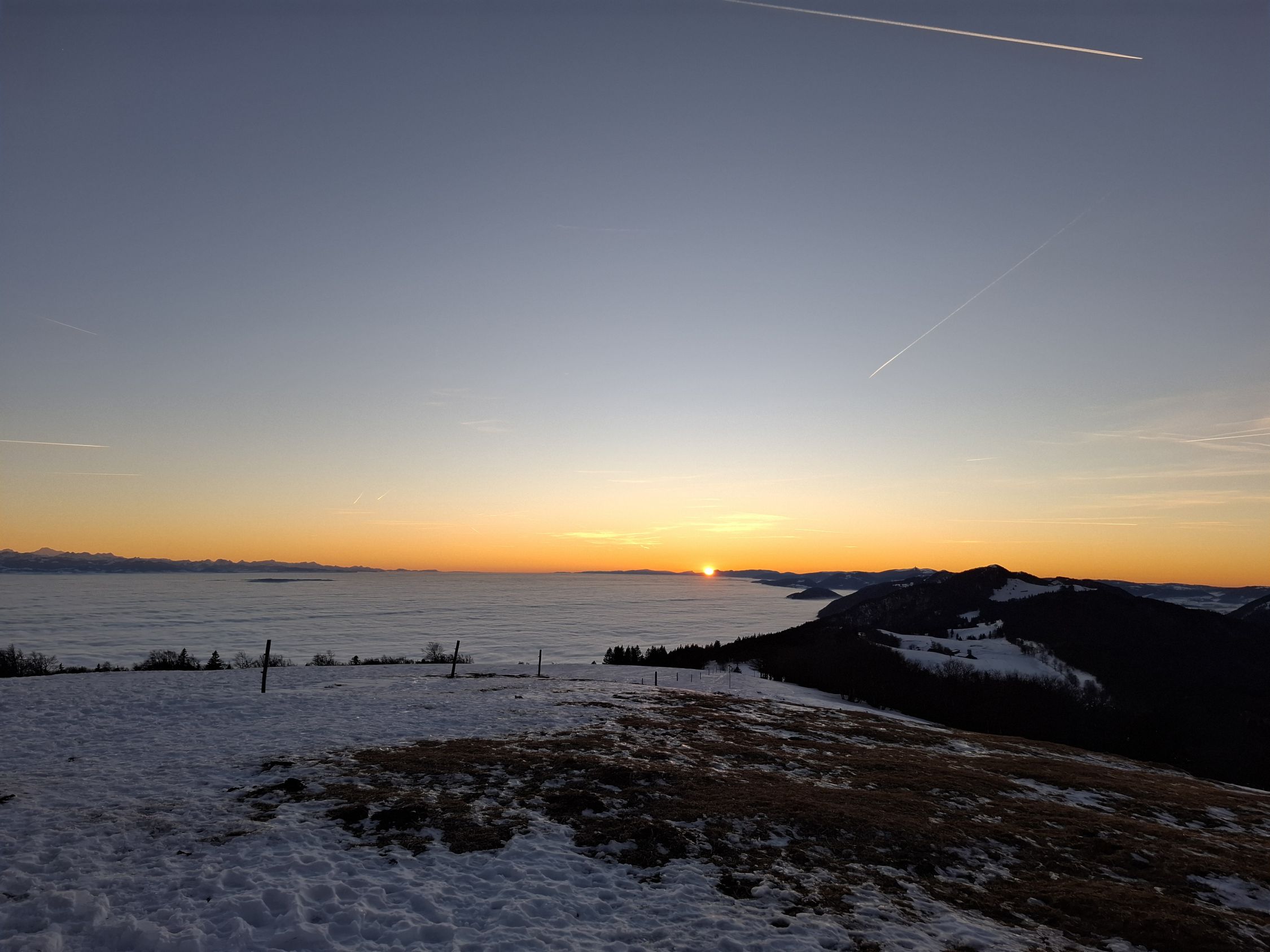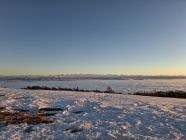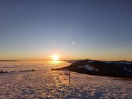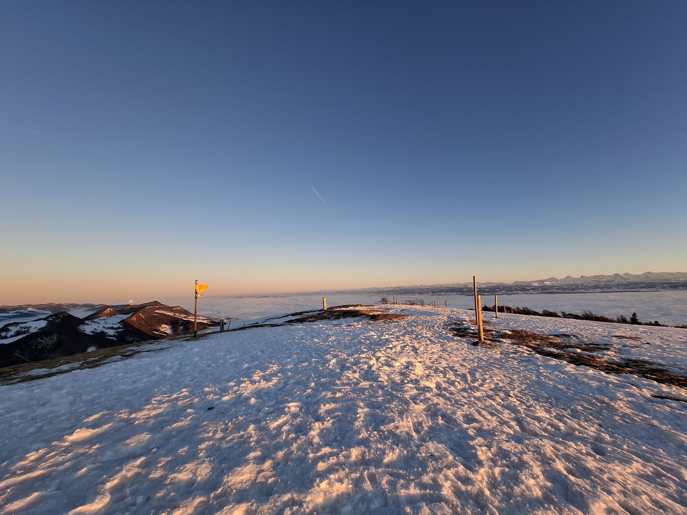 Heute hatte es ganz unten Nebel. Bin ca 15. 30 abgelaufen. Die meisten Stellen der Aufstiegsspur war nass. Durch Fussgänger und Setzung hat die Spur etwas gelitten. Aber geht immer noch gut. Oben nur Schwachwindig. So konnte ich den Sonnenuntergang in Vollenzügen geniesen.