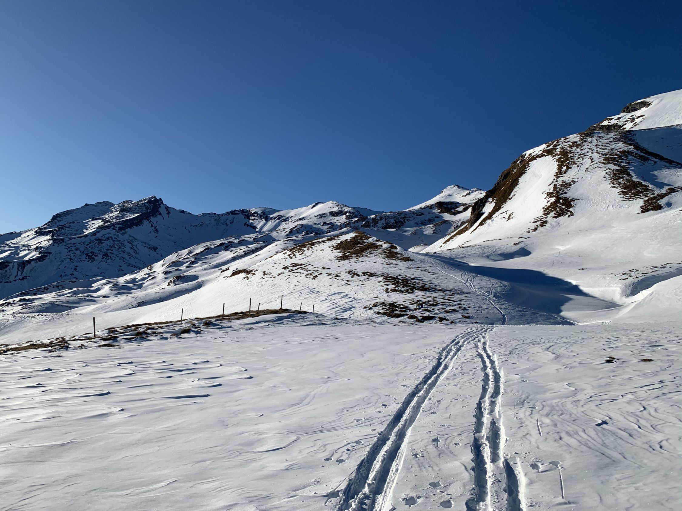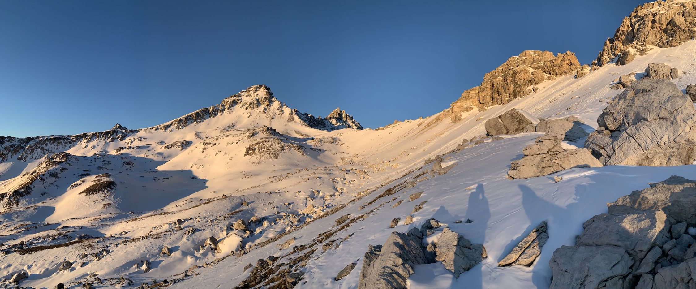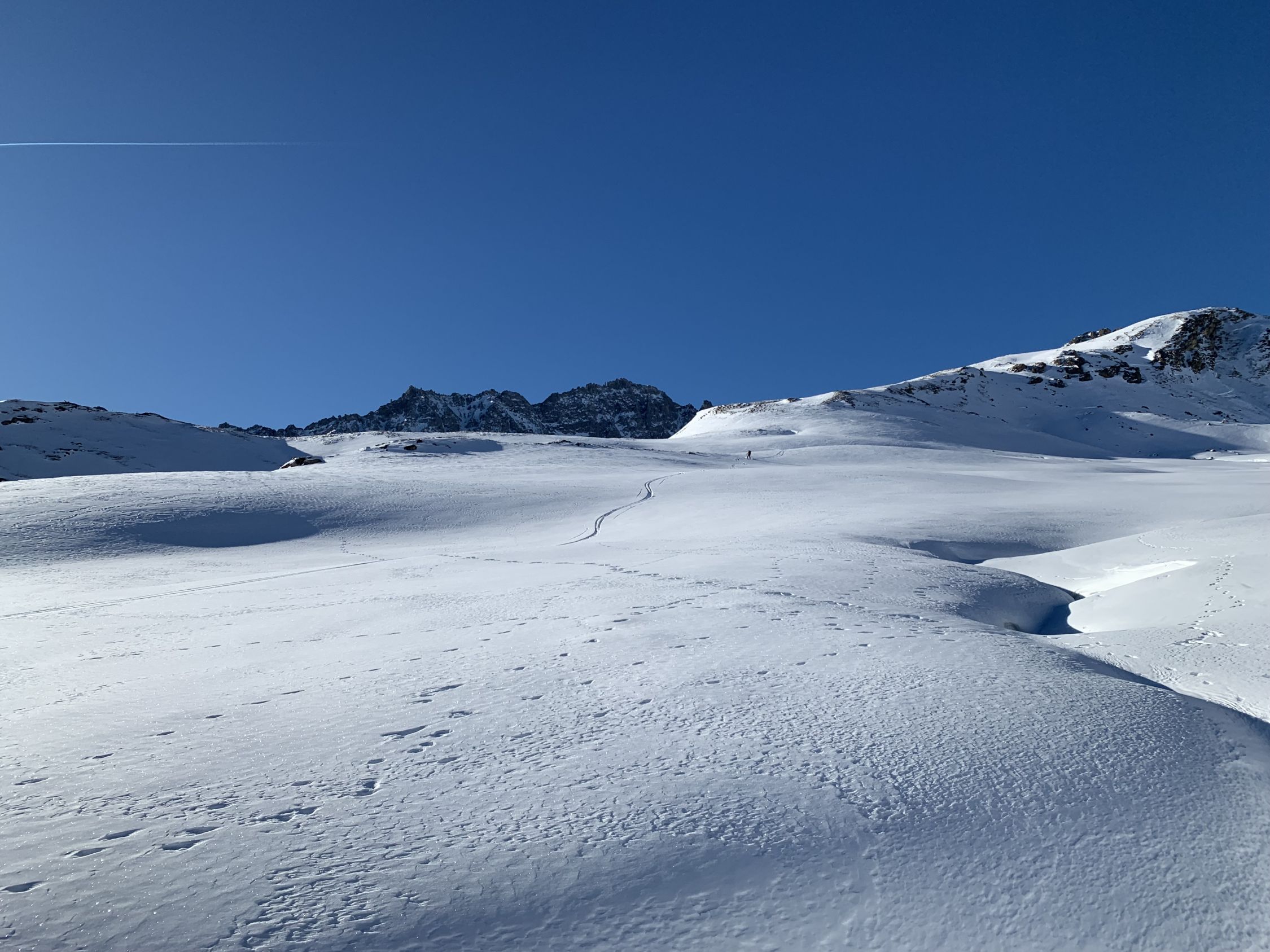 Was den Übergang von der Cufercalhütte über die Forcletta digl Pintg anbelangt, ist allerdings ein „machbar“ noch schmeichelhaft. Die Schneelage ist dort dermaßen dürftig, dass fast kein Durchkommen mehr ist. Es schauen keine Felsen aus dem Schnee, sondern ab und an Schnee aus den Felsen ;-)