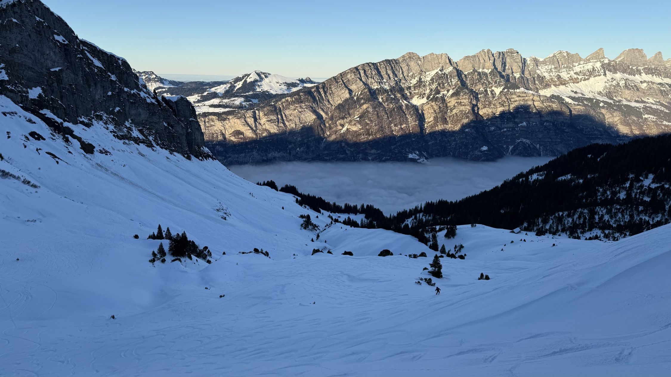 Achtung, der Aufstieg nach Robmen ist mit der Wärme und Sonne nich unheikel. Es gibt schon einen grösseren Nassschneerutsch und eine kleine Gleitschneelawine. Besser den 8.15-Bus nehmen… Und nicht mitten im Hang die Felle aufziehen, sondern am best unterhalb Pt. 1555 bei der Brücke. Und dann zügig durch den Hang…