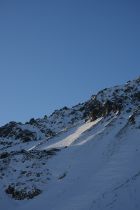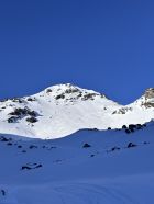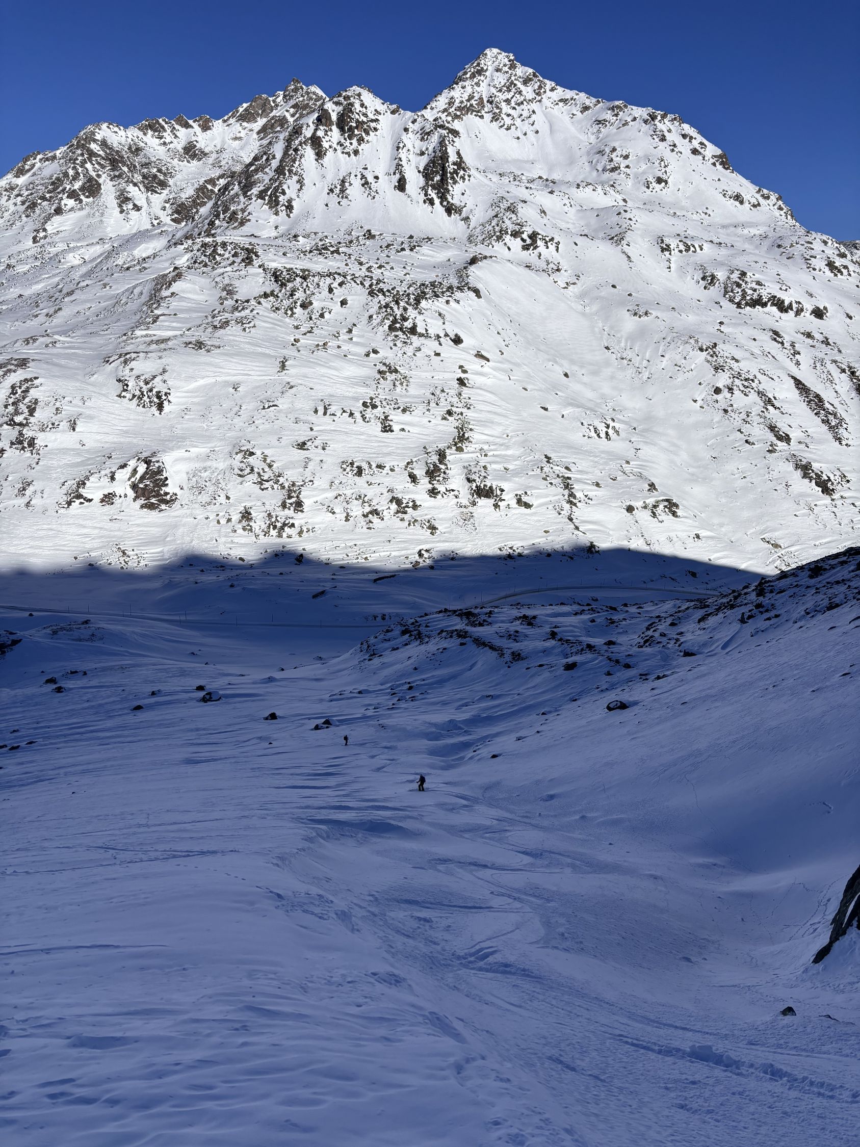 Es hat wenig Schnee auf dieser Tour. Vorsichtige Routenwahl und sanfte Schwünge sind angebracht, da die spitzen Steine sonst auf deinen Ski lauern.