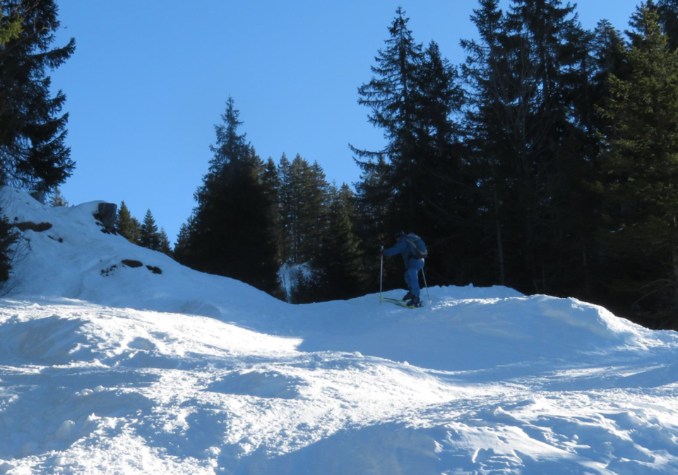 Aufstieg: Breit gespurt, griffig nicht vereist. Viel Schneeschuhspuren. Abfahrt: Kein grosser Genuss im Neuschnee. Unterhalb von Pkt. 1599 auf der Piste. Viele mit Schneeschuhen unterwegs.