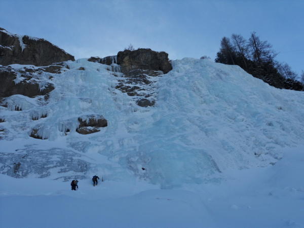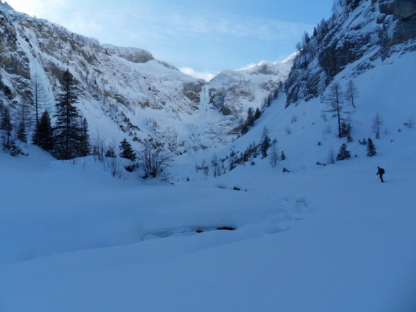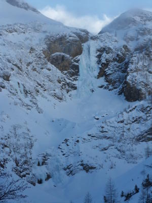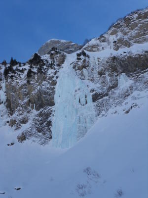Zustieg ab Parkplatz Steinbruch nach Lauenen ca gut 1.5Std.(gespurt von Türeler-merci)an Falleinstieg.Föhnsturm im Kessel,anvisierter Geltenschuss mit Dauertriebschneebefall von oben,hatte 2-3Querrisse von warmer Woche und an Einstieg noch 2 x laut auf sich Aufmerksam gemacht.Fall links leider voll unter Lawienenhang mit 2 kleineren Neuschneebretter von Nacht.Desshalb unmotivierter Abzug und unten am Lauenensee noch schnell an 'Tungelschuss'links (120m,4-,fett aber mega spröd) und lieber ins feine Moospintli am See zu 'Frustsaufen'(nein- halb so wild).