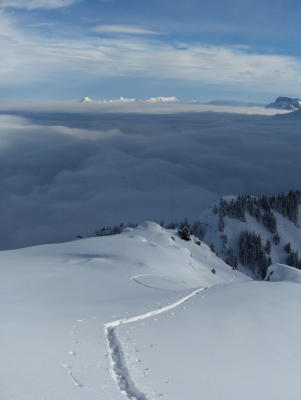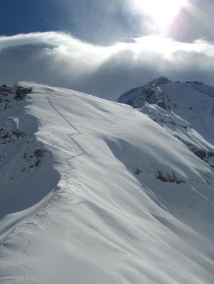 Von Saxeten (1130m) auf dem Schlittelweg bis Underberg (1455m), dann Richtung Oberberg (Spur bis ca. 1600m) und über die E-Flanke auf das Rengghorn (2103.7m). Abfahrt über die W-Flanke zum Renggli (1879m).
