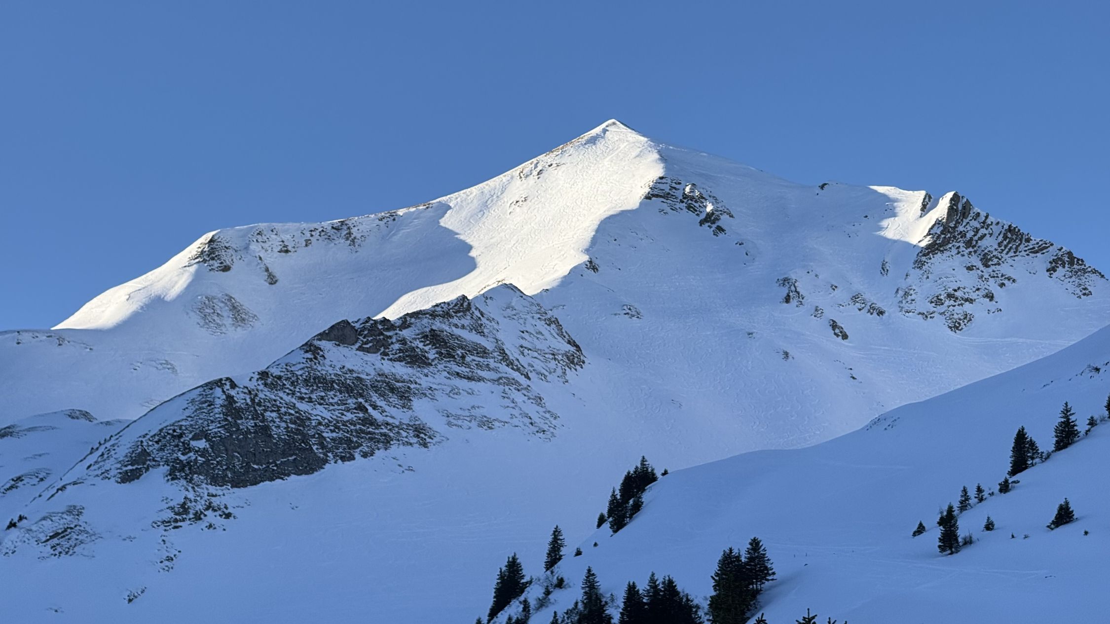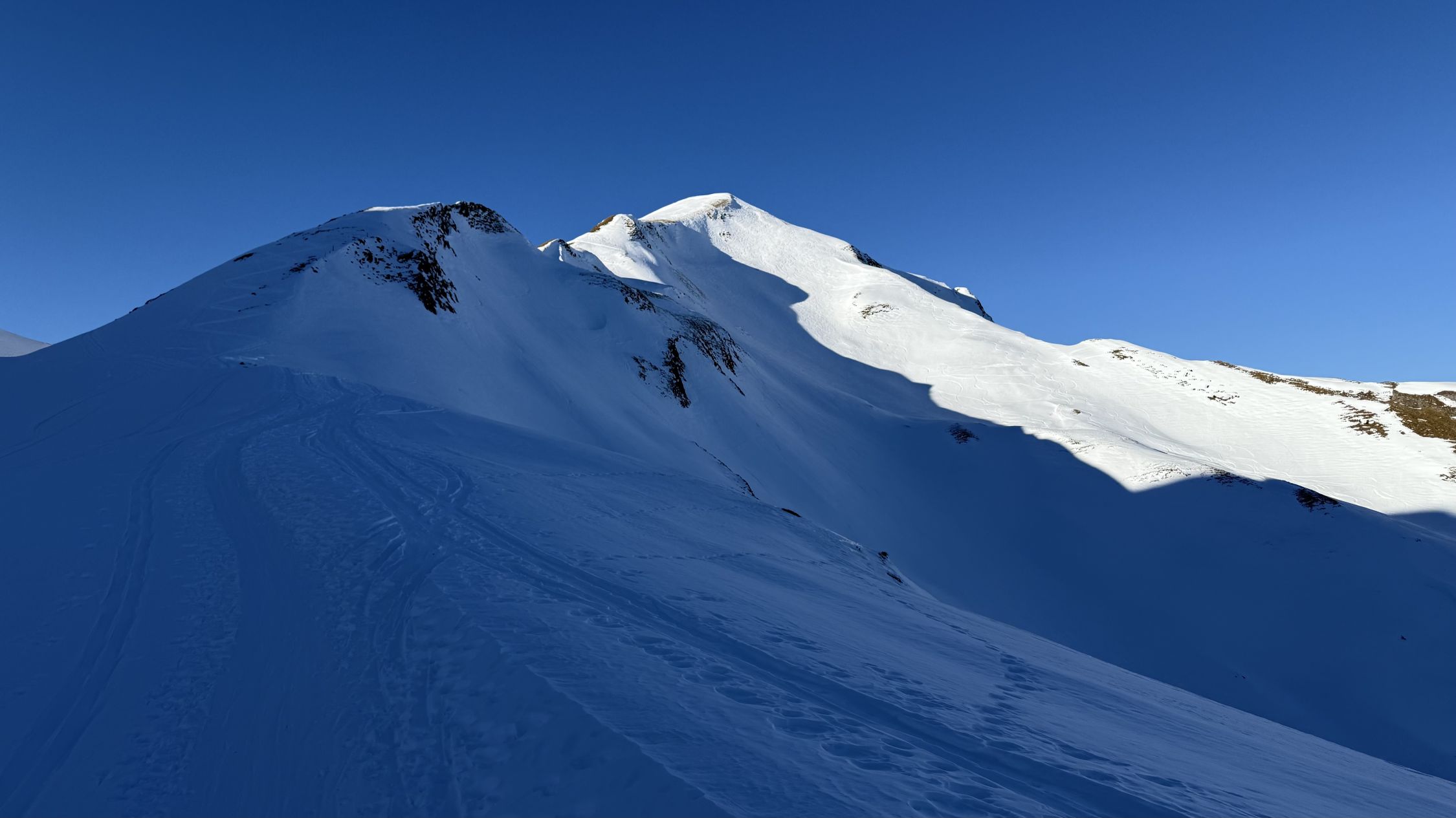 Alle Schattenhänge sind zwar grösstenteils verfahren aber mit diesem Pulverschnee dennoch ganz akzeptabel. Auf der Ostseite zeilweise vereist und die Harscheisen helfen. Der Aufstieg über den Rücken ist nicht mehr durchgehend schneebedeckt. Die Ski's müssen ca. 20 HM getragen werden. Sonst aber noch tipp top.