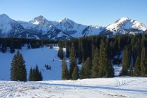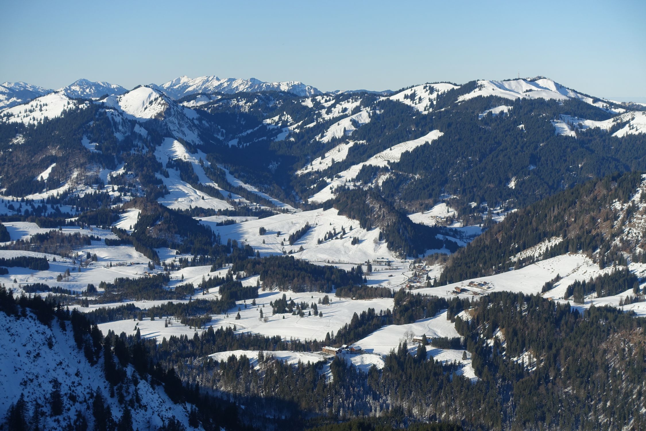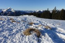 Start um kurz nach 8 Uhr in Zöblen. Wolkenfreier Himmel, ca. 5 Grad minus. Bis Ghf. Zugspitzblick (Fahrweg) schneefrei. Dann durchgängig sehr gute, gut getretene Spur vorhanden. Über den freien Rücken nordöstlich des Zugspitzblickes zunächst ohne Schneeschuhe. Ab Wegweiser (Freifläche) in weitem Rechtsbogen zum "Alten Hof" und auf Fahrwegtrasse unter Rehbichl und Pirschling durch zum Sattel südlich des Gipfels und weiter vollends zum Gipfelkreuz. Sehr gute Sicht, aber frischer Wind. Pause daher etwas südlich unterhalb des Gipfels (windgeschützt).